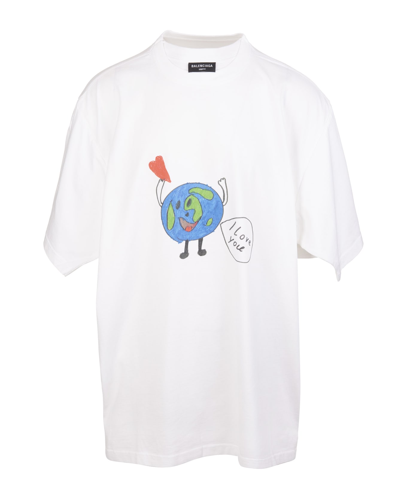 Love Earth Flatground large fit t-shirt by Balenciaga made of white vintage jersey and characterized by a trompe-l' il effect on the neckline, double short sleeves with low shoulders, visible Balenciaga plate and Love Earth motif printed on the chest. Fit: regular for man and oversize for woman. Composition: 100% Cotton