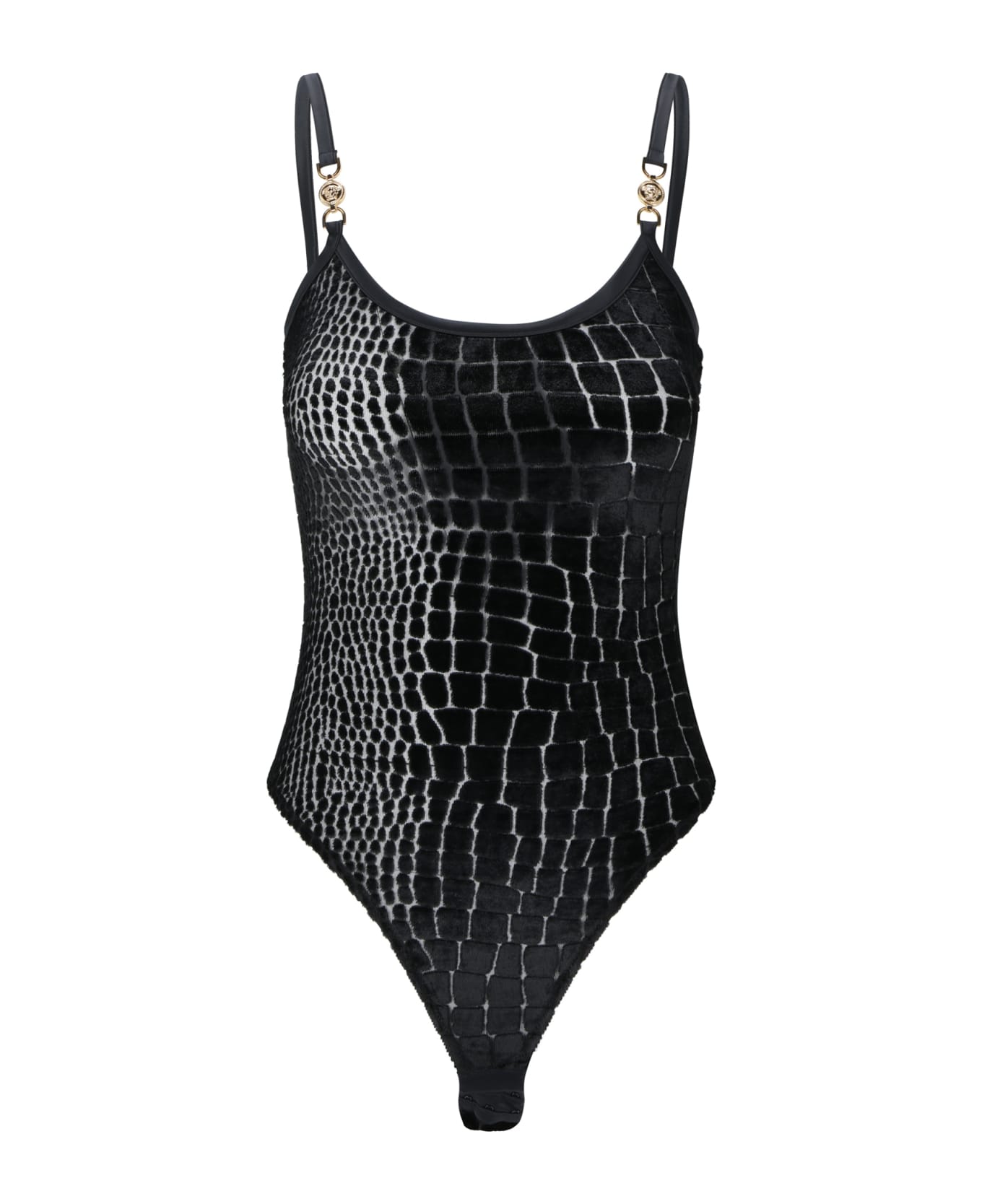 Bodysuit by versace, wide round neckline on front, all-over velvet crocodile-effect semi-transparent pattern, thin straps with brand's iconic medusa embossed plaque, classic closure on brief by hook-and-eye fasteners, slim fit.