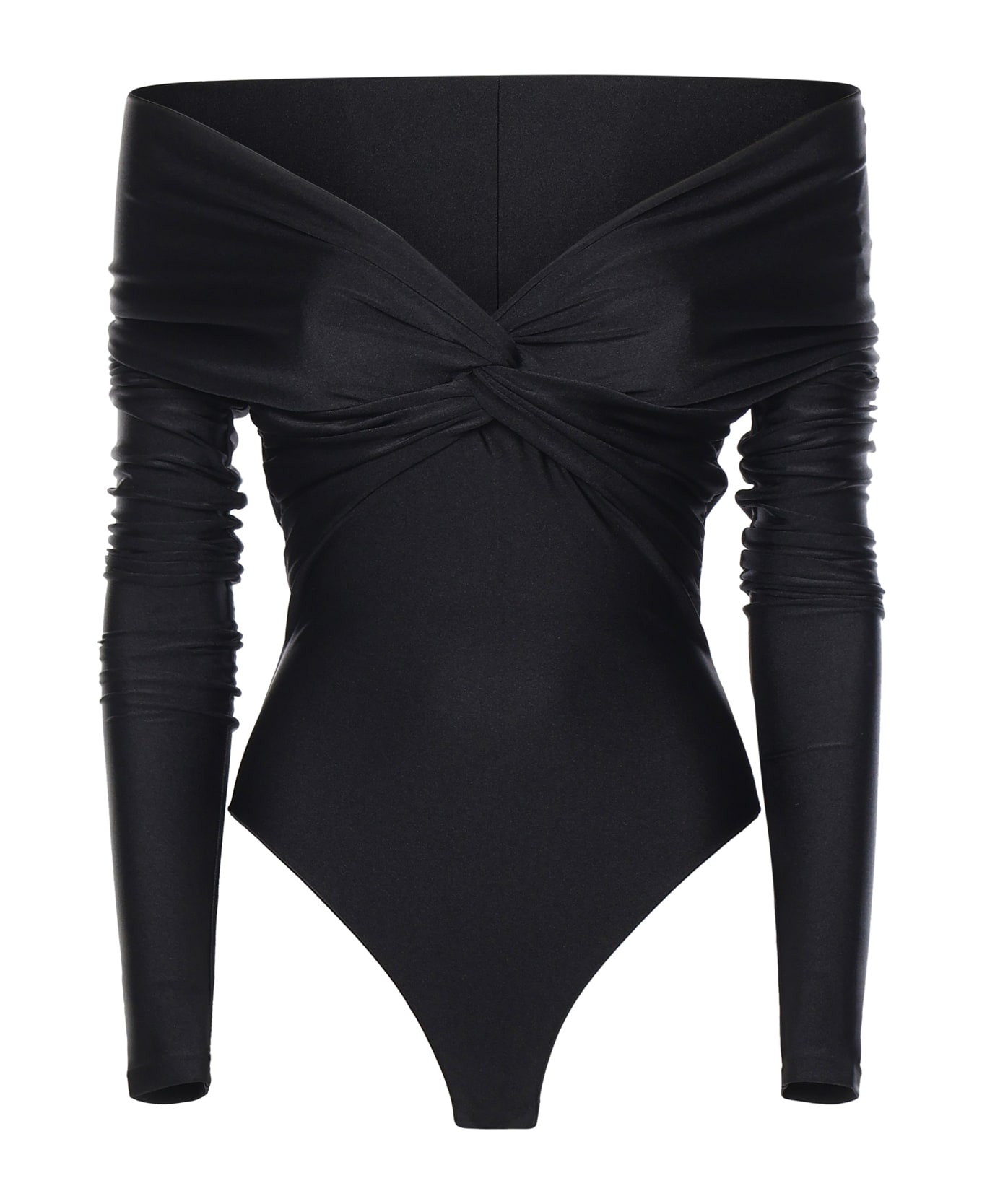 -Off-the-shoulder -Long sleeves -Draped detail on the chest -Size shown is XS -Made in Italy -Color: Black