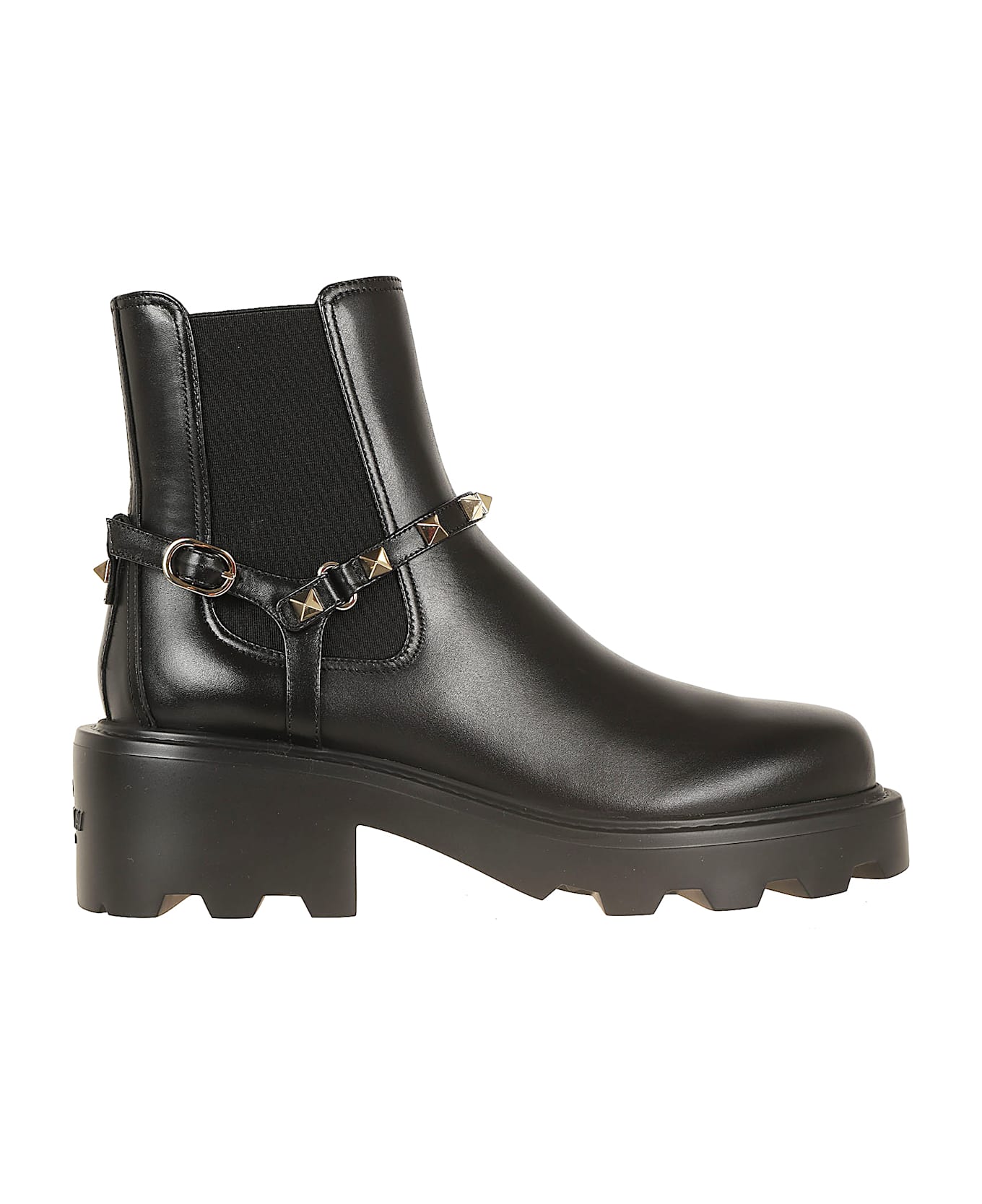Calfskin Beatle BY VALENTINO GARAVANI. Side elastics; adjustable strap with buckle; platinum-finish studs. Heel height 5. 5cm. Featured with rubber lug sole personalized with VALENTINO GARAVANI logo.