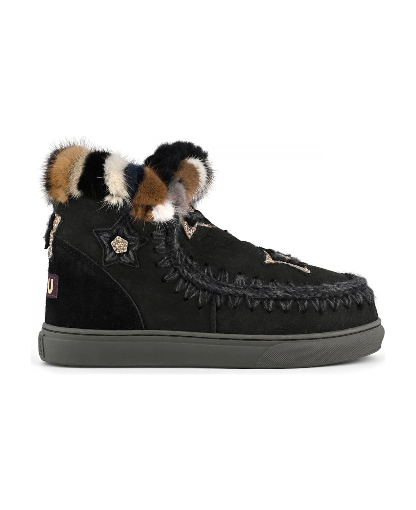 Eskimo sneaker with mink fur trim and star patches, black double-face sheepskin, hand-crochet wool stitching, comfort rubber sole, style height 16cm.