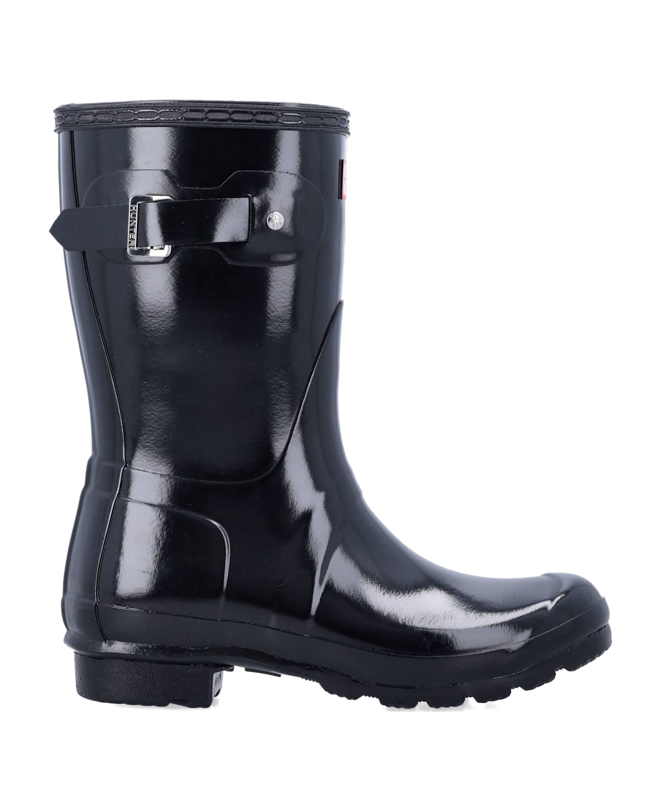 Original Short Gloss Boots By Hunter. Featuring: Slip-on Waterproof Glossy Rubber Upper "hunter" Logo Patch On Top Lateral Adjustable Strap With Buckle Organic Cotton Lining Round Toe Rubber Sole