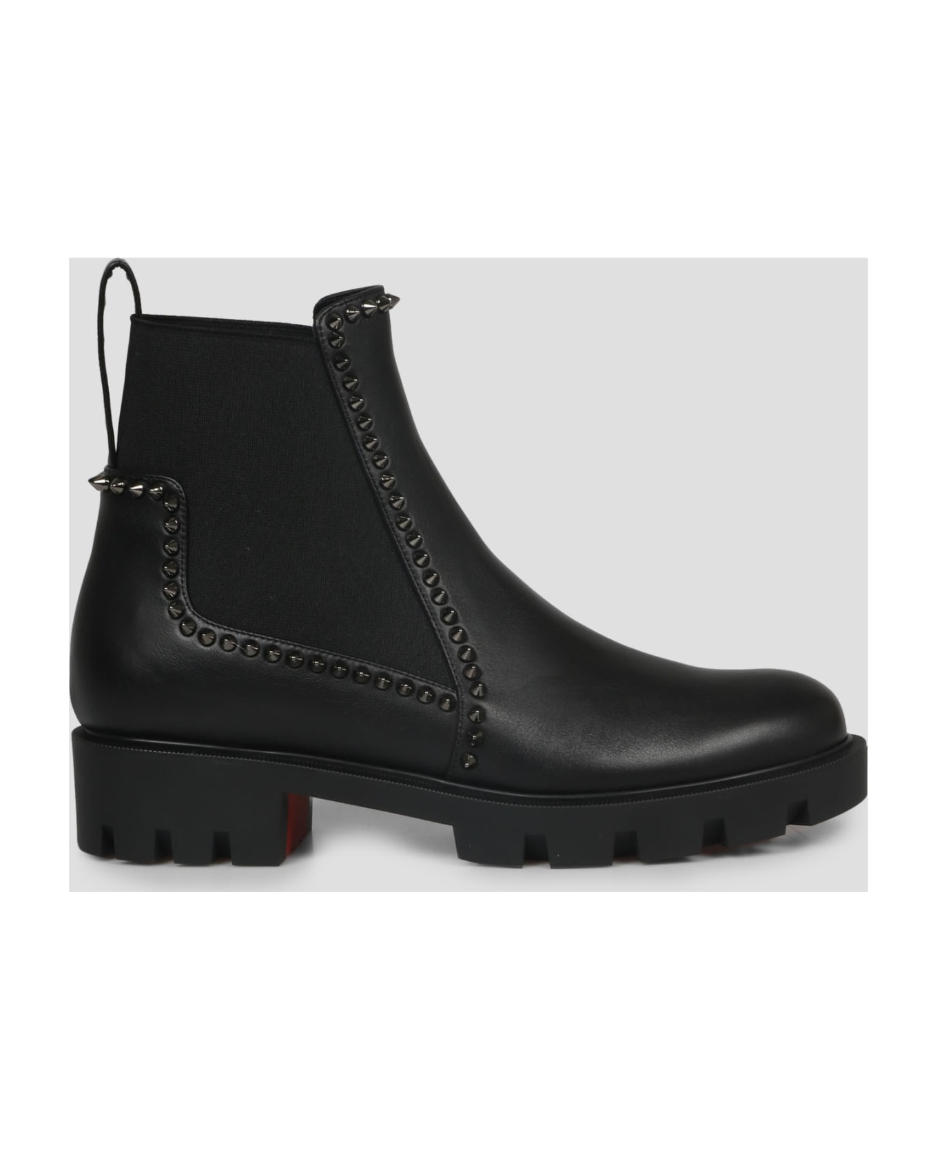 Christian Louboutin Out Line Lug ankle boot, in smooth leather embellished with signature spikes on the edge. - Round tip - Side stretch panels - Loop on the back - Silver-toned spikes - Rubber lug sole - Made in Italy - Calf leather