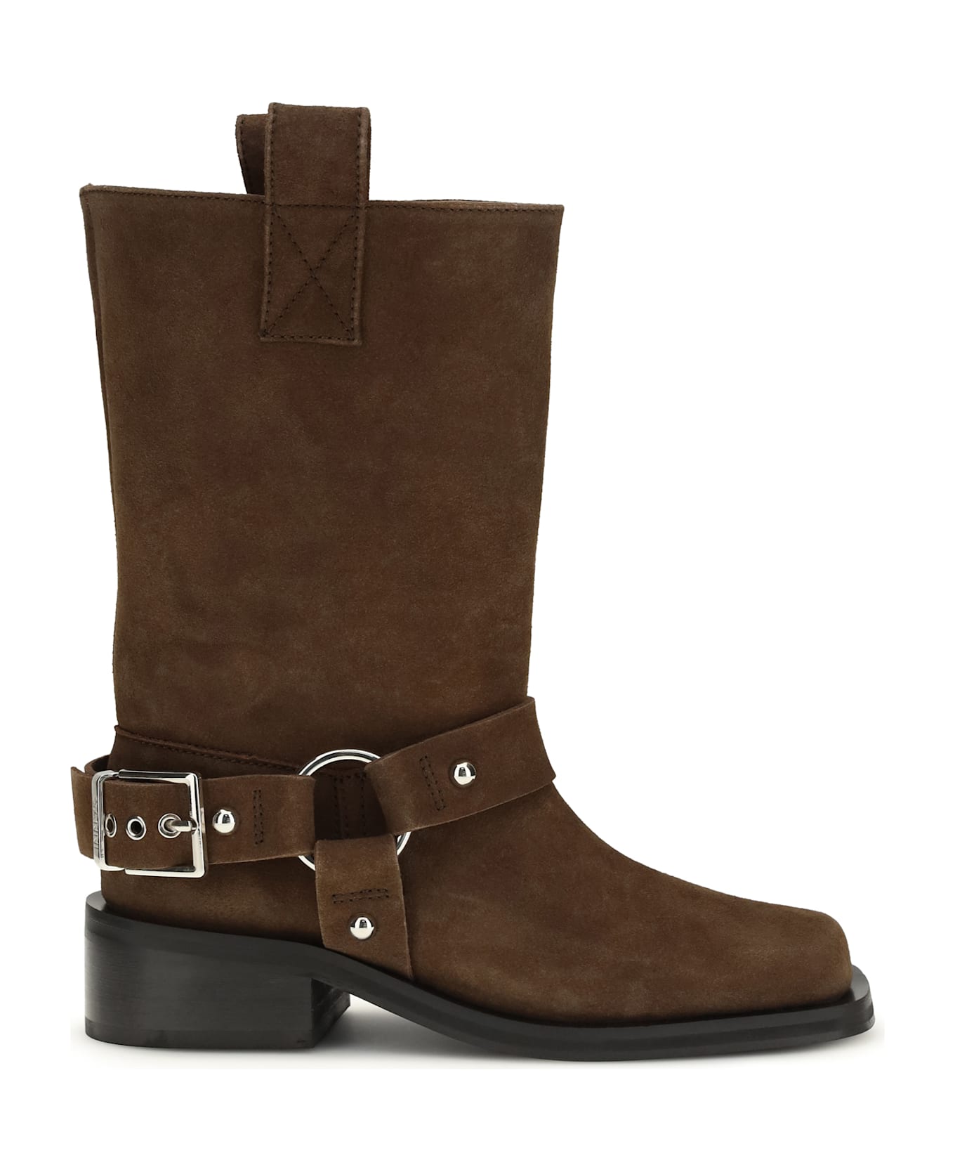 The suede biker boots by ganni combine bold design with a touch of sophistication. featuring a square toe and block heel, they offer stability and comfort. the tabs and buckle strap with studs add character, making these boots ideal for a bold, contemporary look. perfect for completing both casual and more structured outfits, they are a must-have for those looking for a touch of grit and style.