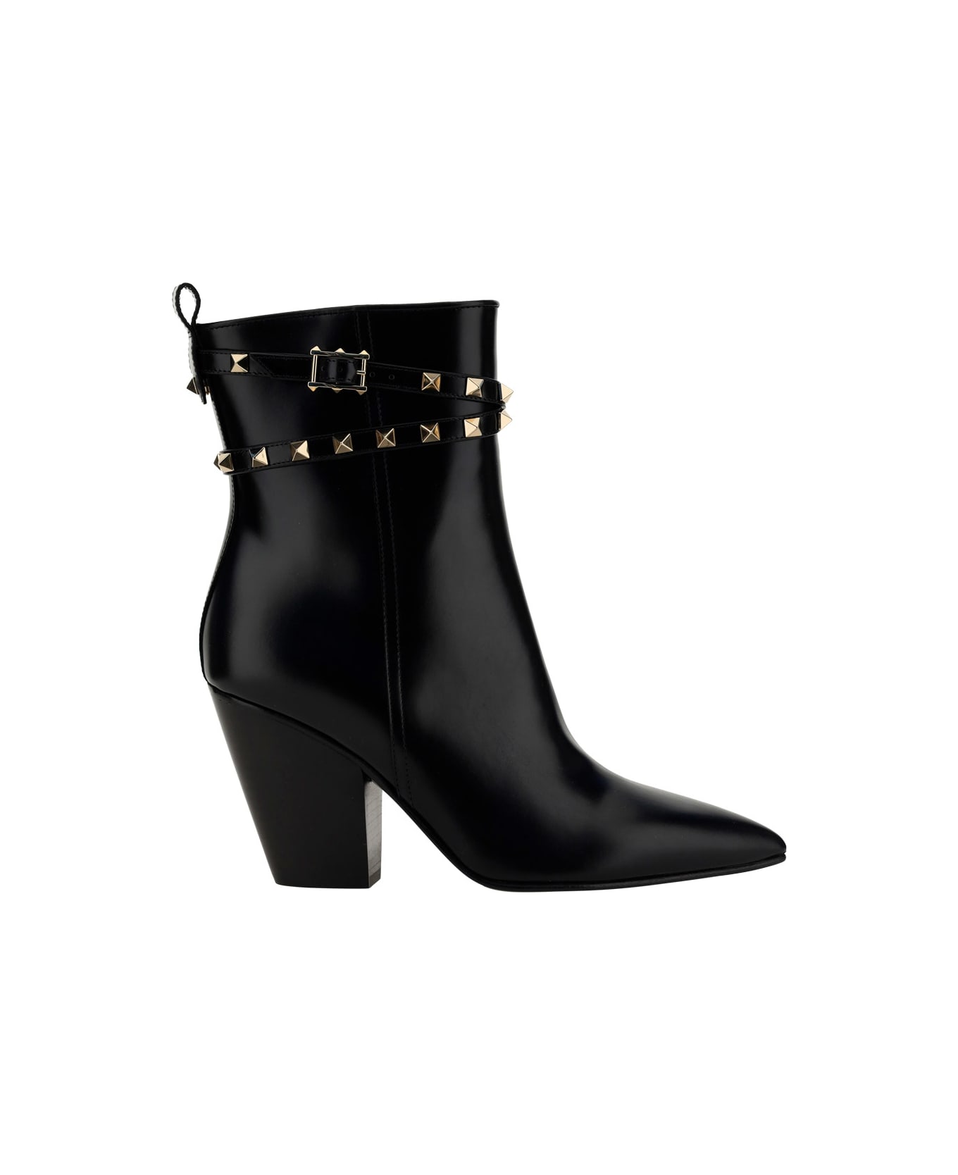 Calfskin heeled ankle boots by valentino garavani, almond toe, leather chunky heel, zipper closure on interior side panel, ankle lap strap detail with the brand's iconic all-over contrasting applied studs. Composition: 100% % Calf Leather Bos Taurus, 100% % Calf Leather Bos Taurus