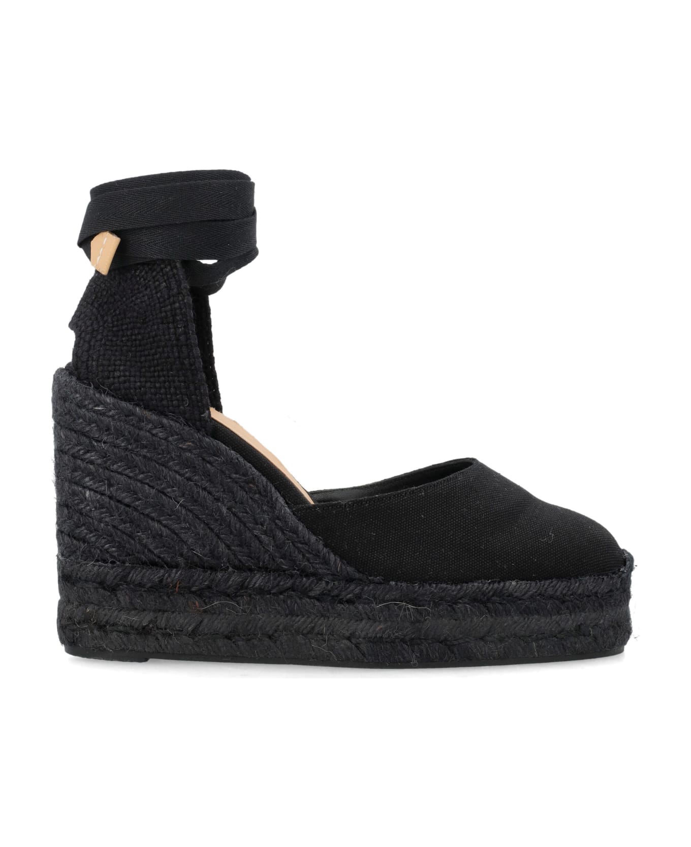 Castañer Carina 8 Cotton Espadrilles Are A Timeless Summer Essential Reimagined In A Refined Tone-on-tone Black Palette. Crafted From Cotton Canvas, They Feature A Wedge Silhouette With A Rounded Toe And A Braided Heel Detail That Highlights The Brand s Artisanal Heritage. The Ankle Lace-up Fastening Adds A Feminine Touch, While The Vulcanized Jute And Rubber Sole Ensures Comfort And Stability. Designed To Elevate Warm-weather Looks With Understated Elegance. Cotton Canvas Upper Wedge Espadrille Design Braided Detail At The Heel Ankle Lace-up Fastening Rounded Toe Vulcanized Jute And Rubber Sole Heel: 8 Cm