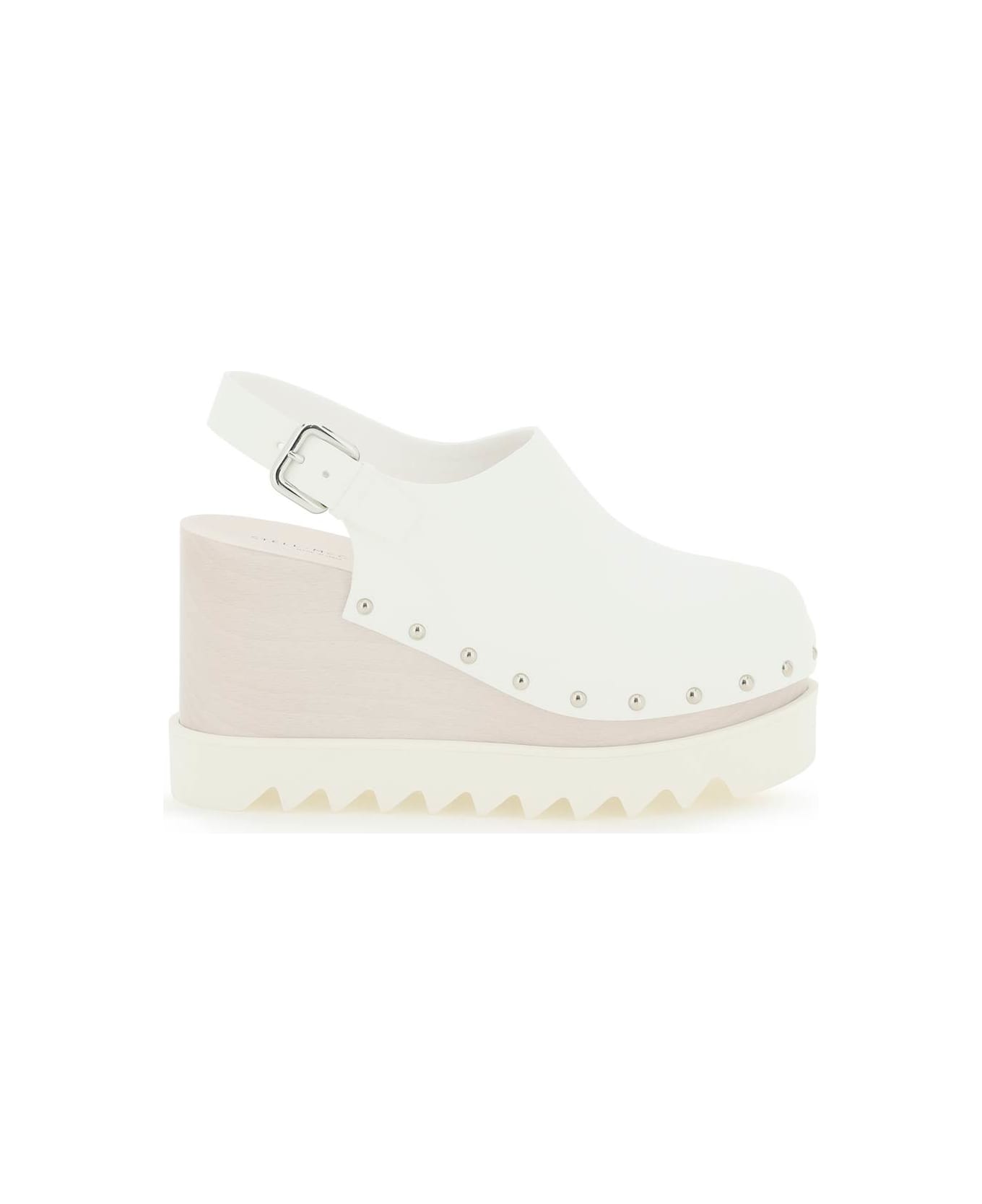Stella McCarteney "Elyse" clogs made of faux leather and finished with studs. Adjustable strap, wedge heel and notched rubber sole. Silver-finished metalware. Composition: 70% PU, 15% PL, 15% PA