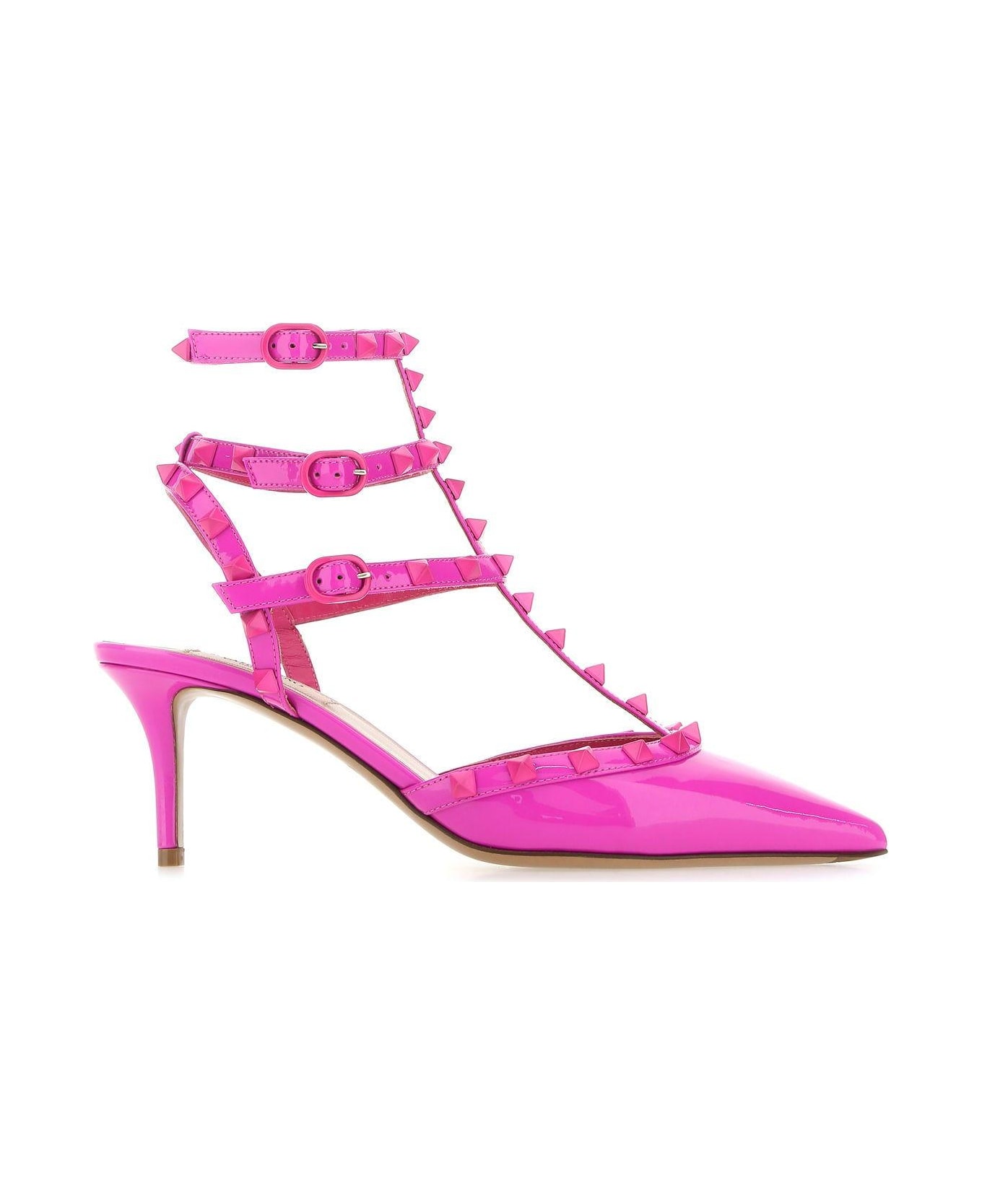 Slingback realized in patent calf leather enriched by enameled metal studs on the trimmings. - Adjustable ankle straps closure - Pointed toe - Thick heel - Logoed label on the inside Composition: Exterior: 100% Calf Interior: 100% Leather Sole: Leather