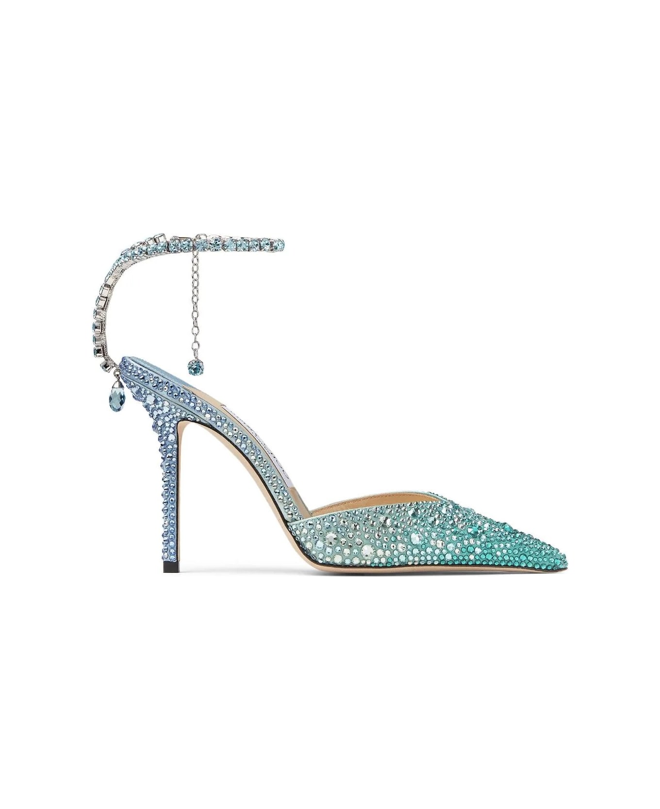 Saeda 100 pumps by Jimmy Choo made of peacock blue satin embellished with crystals. Model embellished with a sparkling crystal chain with a single crystal pendant that delicately adorns the ankle like a jewel. This pointed sandal with a 100-metre stiletto heel is a statement piece embellished with a crystal drop pendant. Composition: 100% Leather