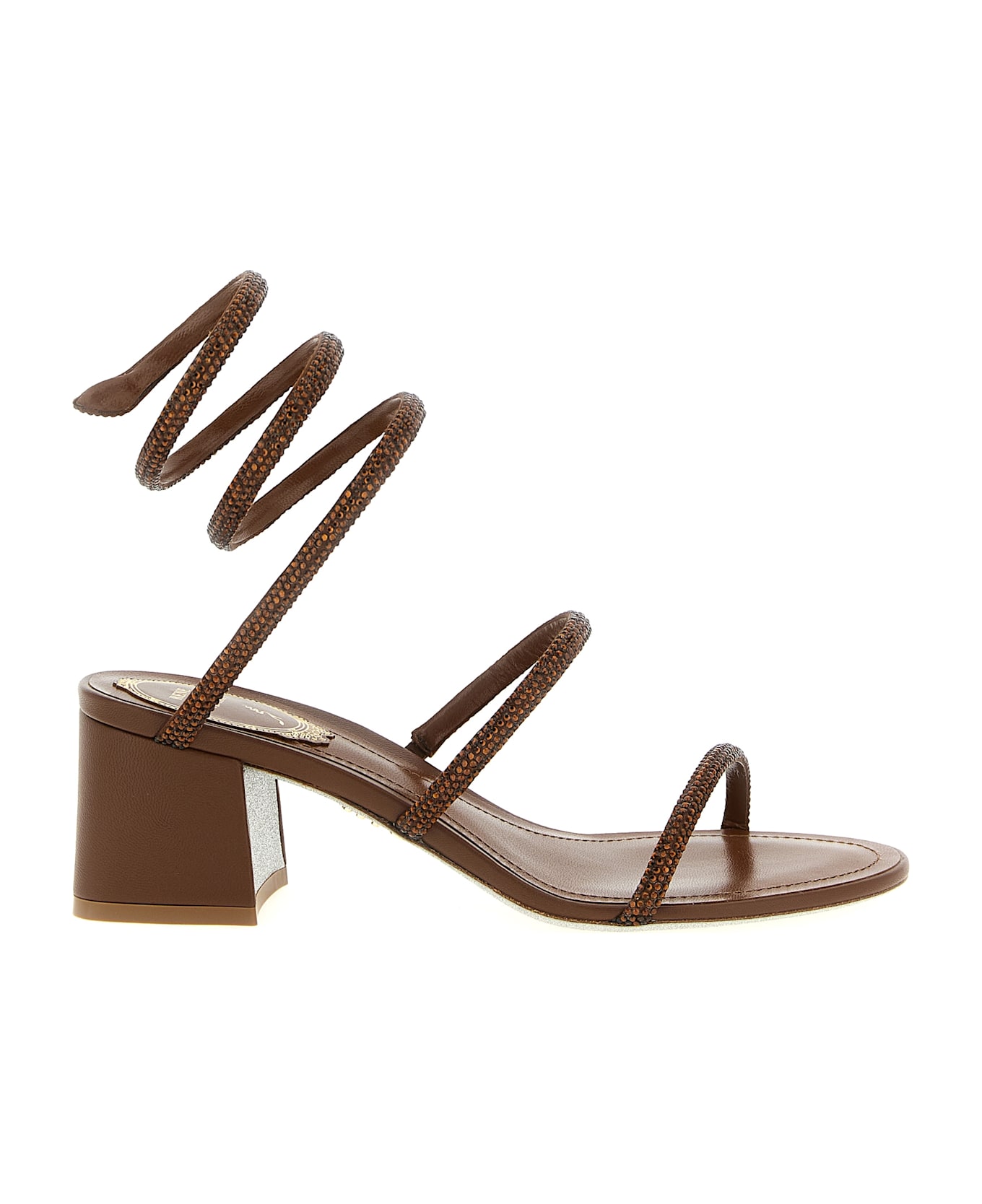 'Cleo' leather sandals with all-over crystal appliqué, ankle wrap band with snake head end, block heel, stardust sole. Composition: 68% viscose, 32% silk