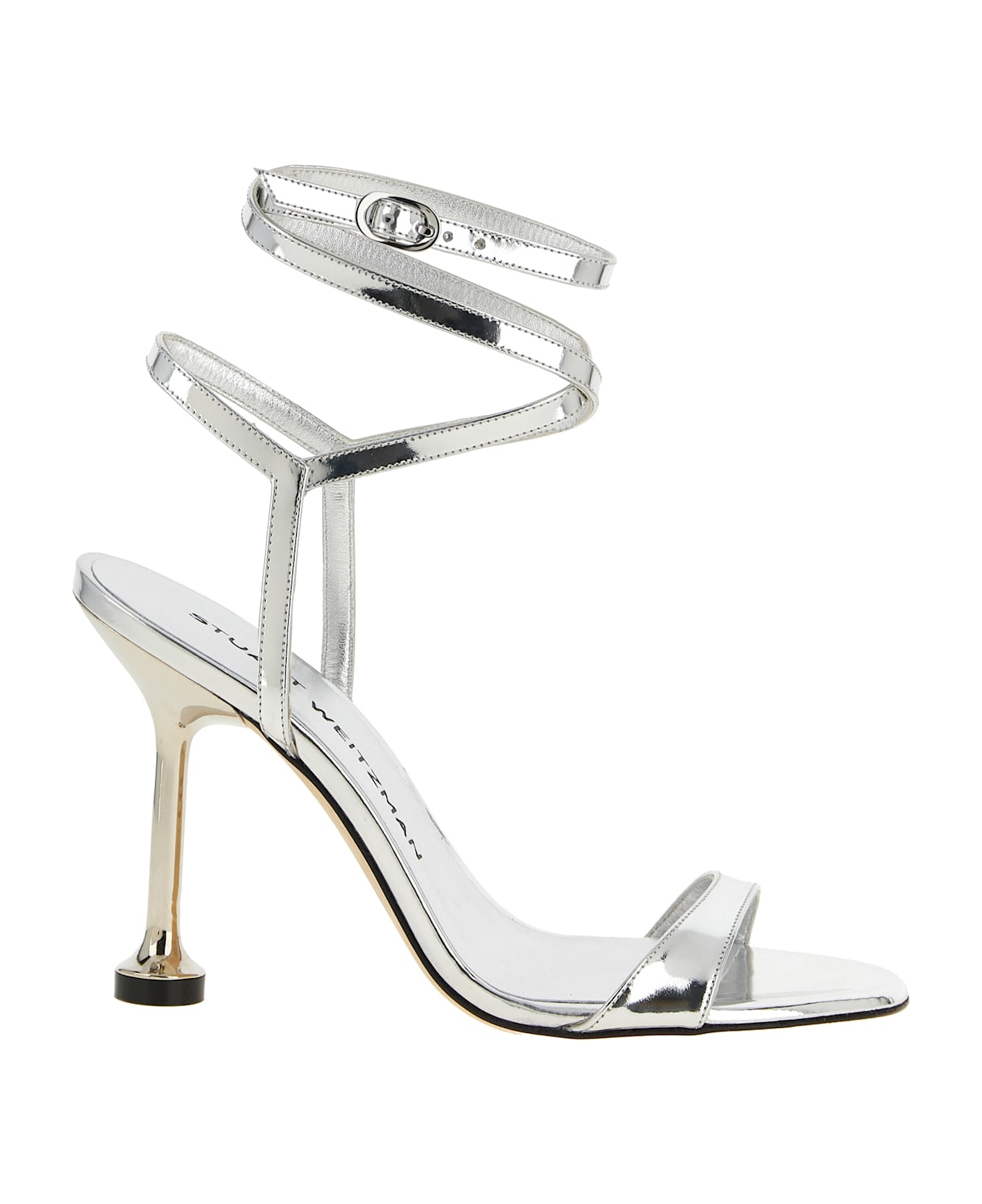 'Nudistini Wrap' mirrored leather sandals with rounded toe, adjustable multi-turn ankle strap, meticulously sculpted martini heel, leather sole.