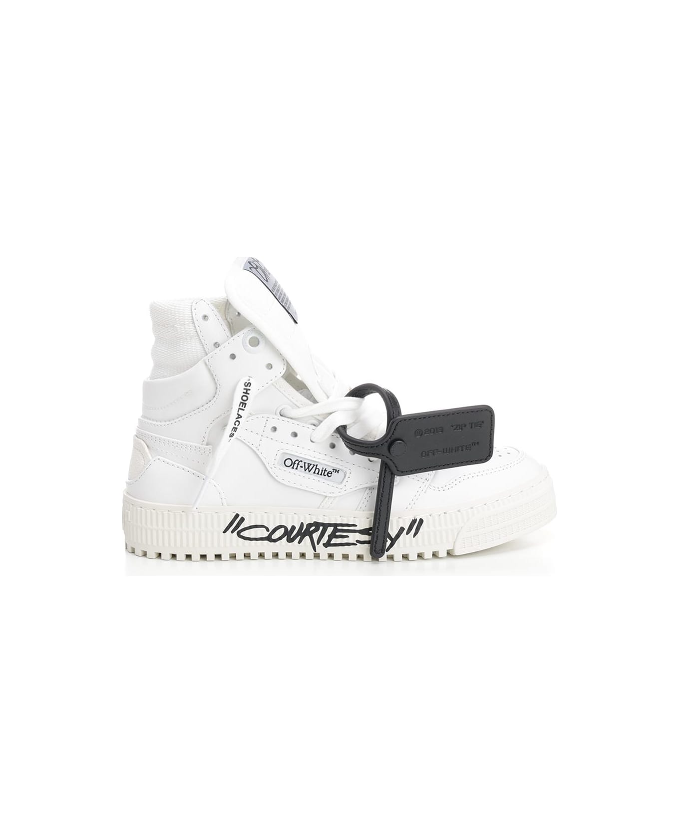 "3. 0 Off-Court Courtesy" leather sneakers by Off-White, with rubber sole with quote. Label with "ZIP TIE" writing. Composition: LINING 40% POLYESTER 60% BOVINE LEATHER - sole 100% RUBBER - upper shoe 21% POLYESTER 79% BOVINE LEATHER
