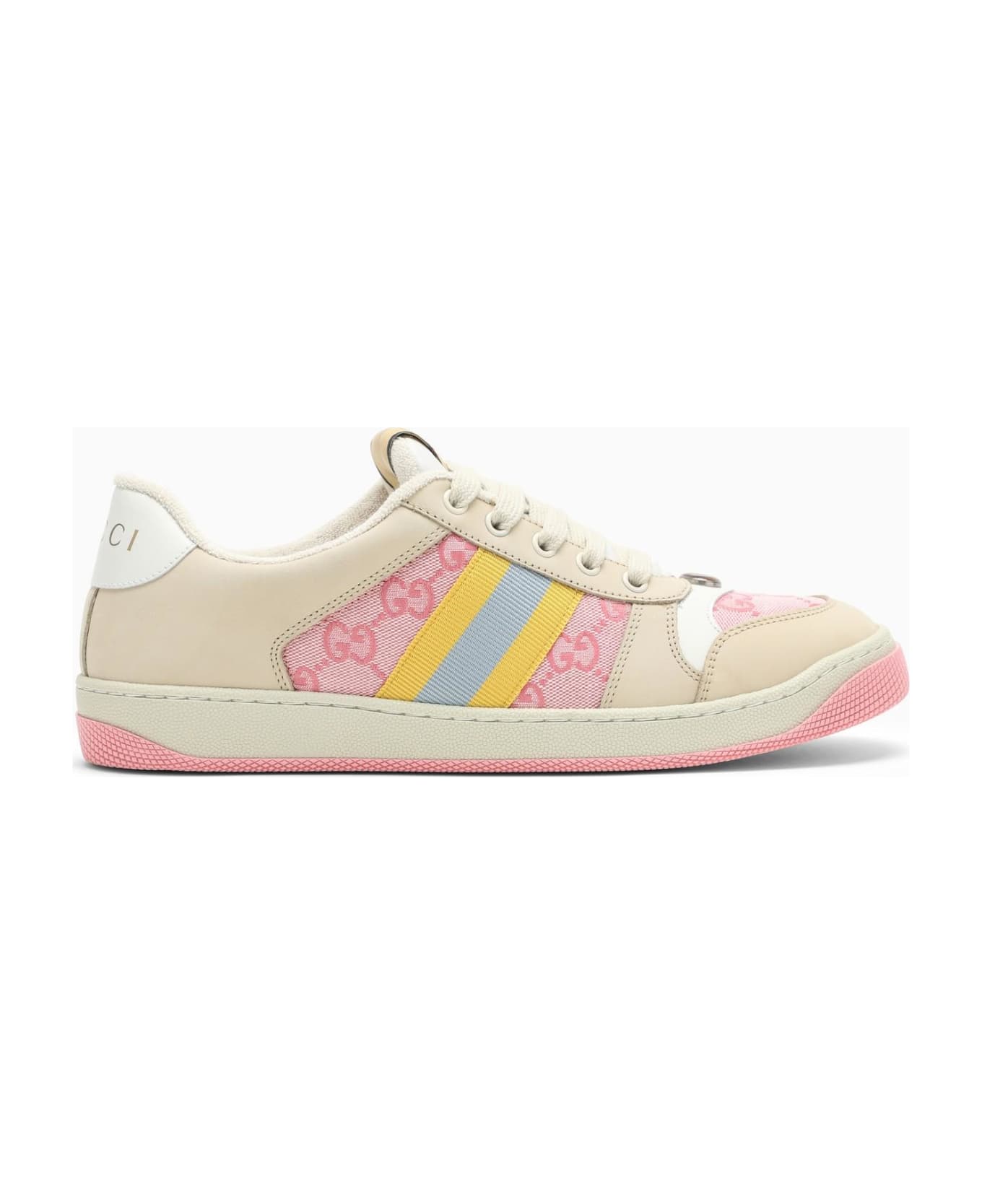 Beige and pink fabric and leather low top trainer from Gucci featuring a round toe, a lace-up fastening, an all-over GG logo, a side web detail and a rubber sole. Composition: 70% Cotton - 30% Polyester / Leather details / Rubber sole