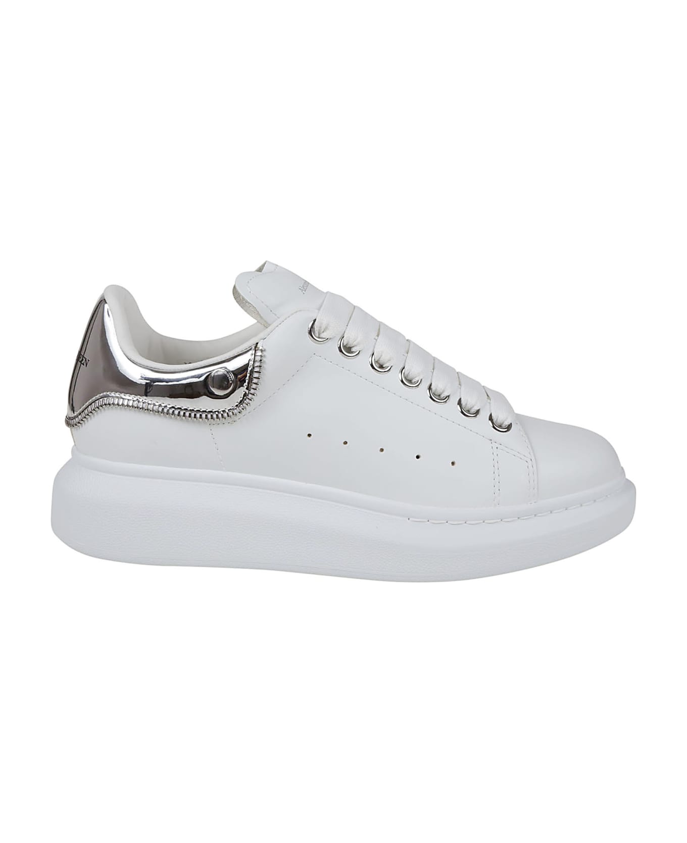 Oversized leather sneakers BY ALEXANDER MCQUEEN. Fastened with wide flat laces, oversized sole. Contrasting detail on the back with Alexander McQueen logo, also present on the tongue. Mirror heel and edges with zip teeth. It can be worn with both casual clothing and a dress. A real must for both winter and summer seasons, with the variation of color.