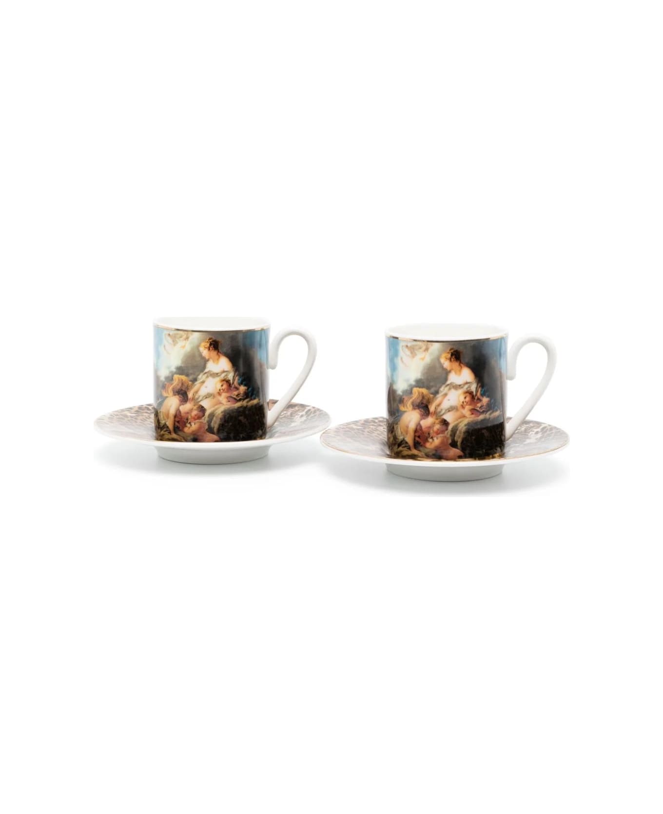 Set of two coffee cups from the Wild Leda capsule by Roberto Cavalli made of porcelain and decorated with Wild Leda print inspired by Baroque paintings. The two porcelain saucers are decorated with the Maison's signature animalier motif. Gift box included with gilded Roberto Cavalli signature.