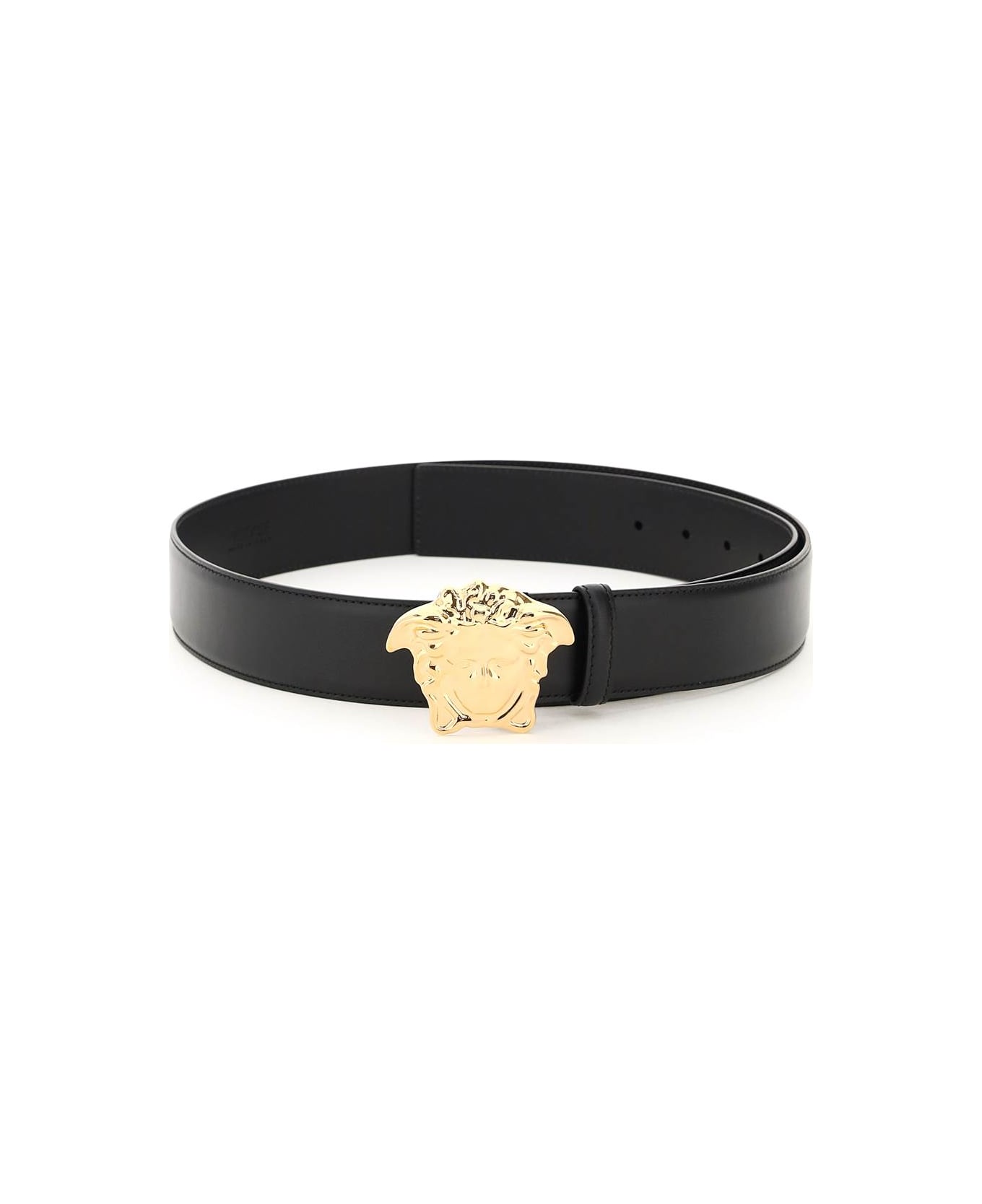 Versace belt crafted in smooth leather and characterized by the iconic 'La Medusa' pin buckle in gold-finished metal. Composition: 100% LH