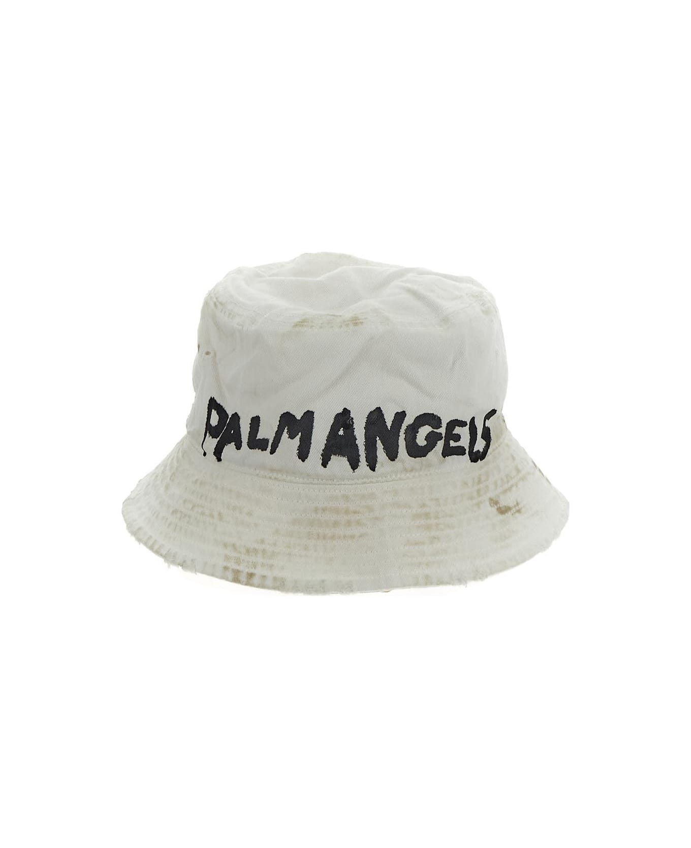 Palm Angels bucket hat in beige cotton with tone-on-tone dirtying, ripped hems detailing and black painted logo. Composition: 100% Cotton