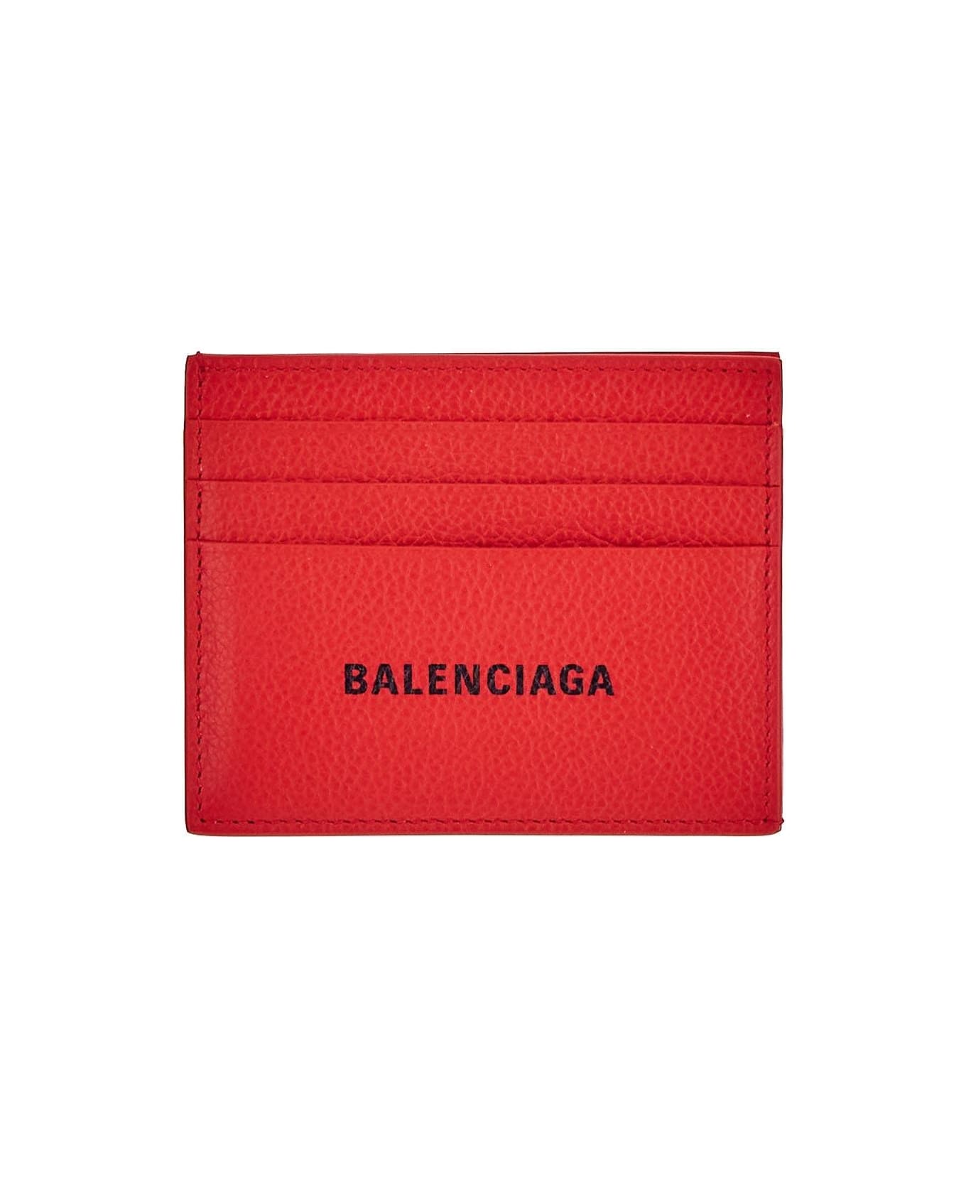 Balenciaga card holder in tomato red grained calf leather with black logo printed on one side, six card slots and a bill pocket. Composition: 100% Calf Leather