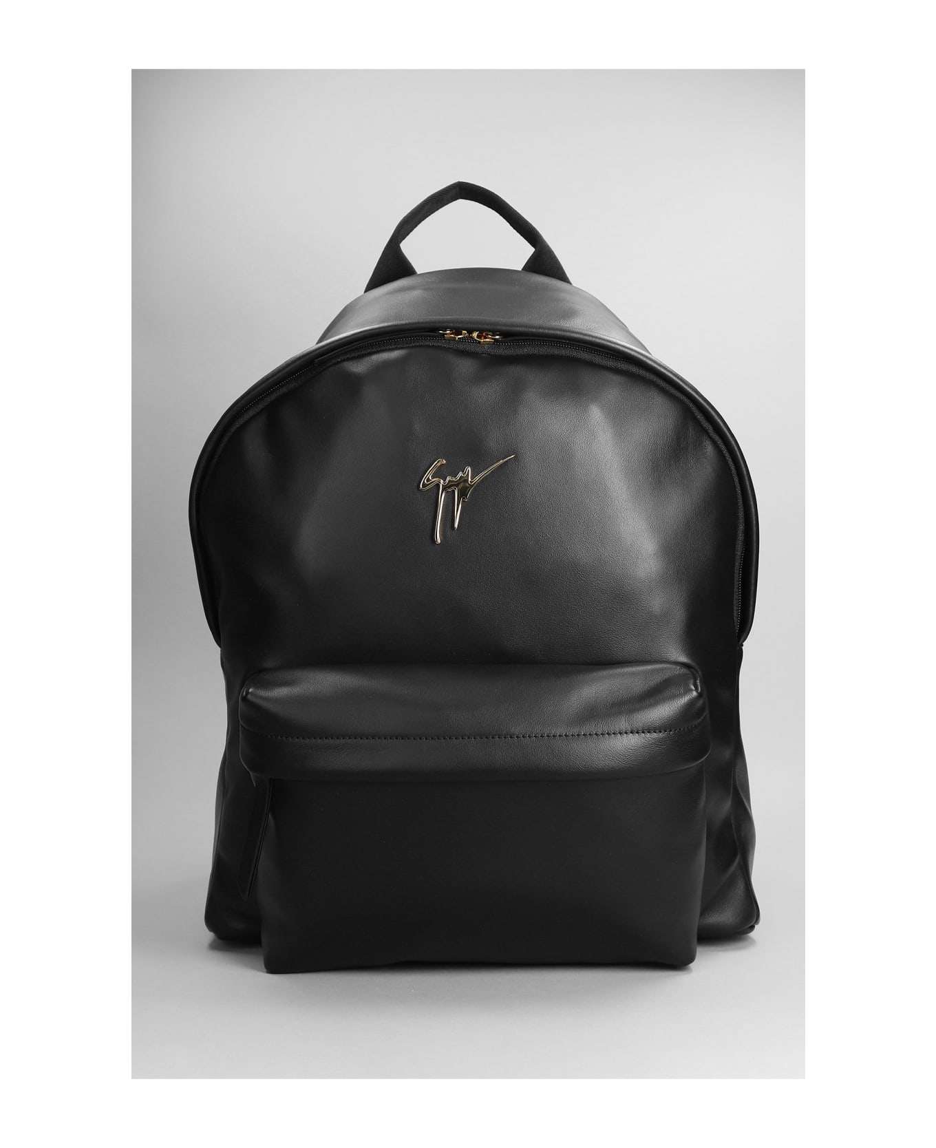 Backpack in black leather, Height 440 mm, Width 340 mm, handle, adjustable shoulder strap, frontal zip pocket, zip clousure, metallic logo, 100% leather, Made in Italy