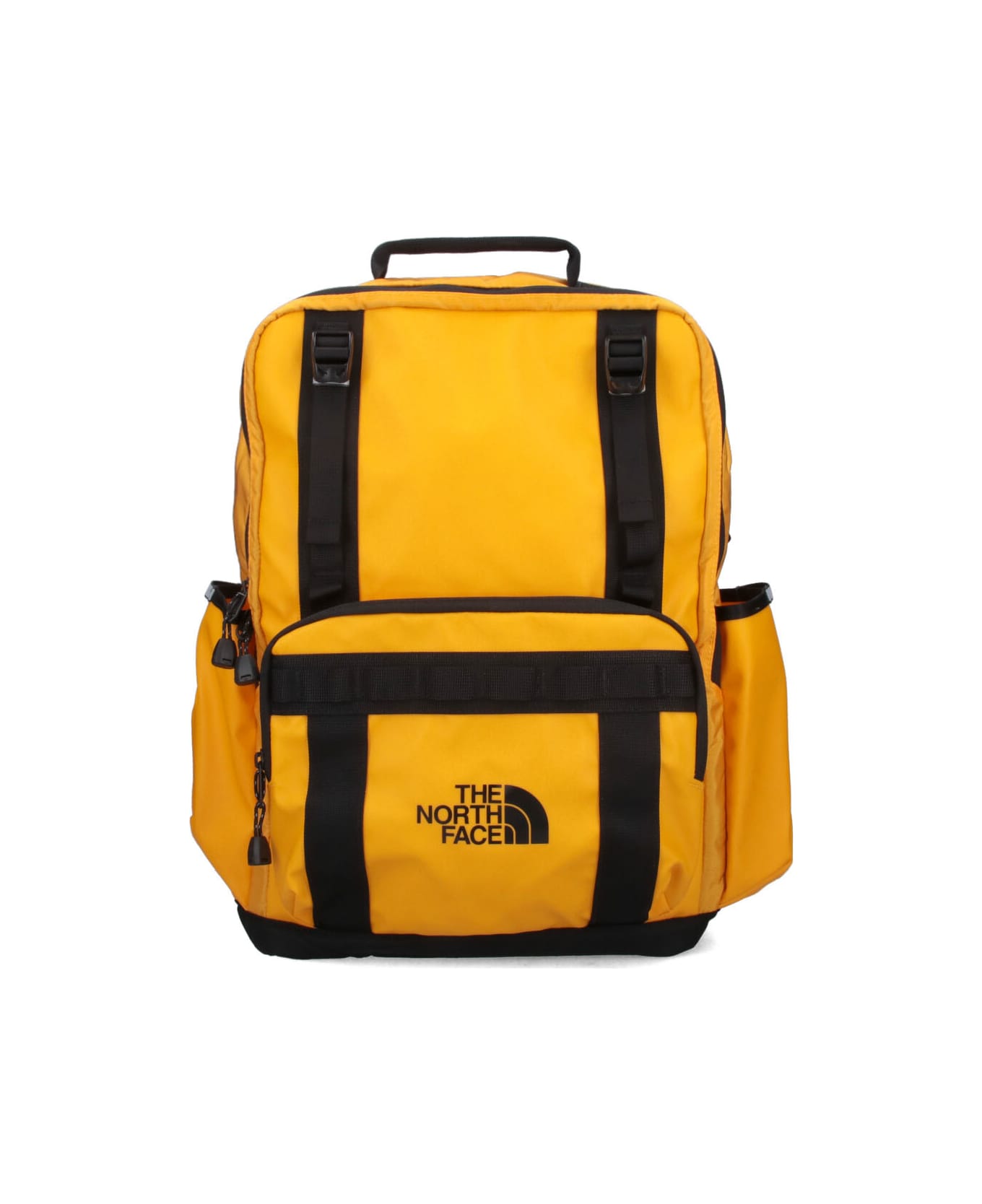 The North Face "Base Camp" backpack in yellow fabric with handle, two adjustable shoulder straps at the back, double zip closure, maxi front pocket, black logo print detail, two side flat pockets, adjustable front straps, inner flat pocket, main inner compartment.