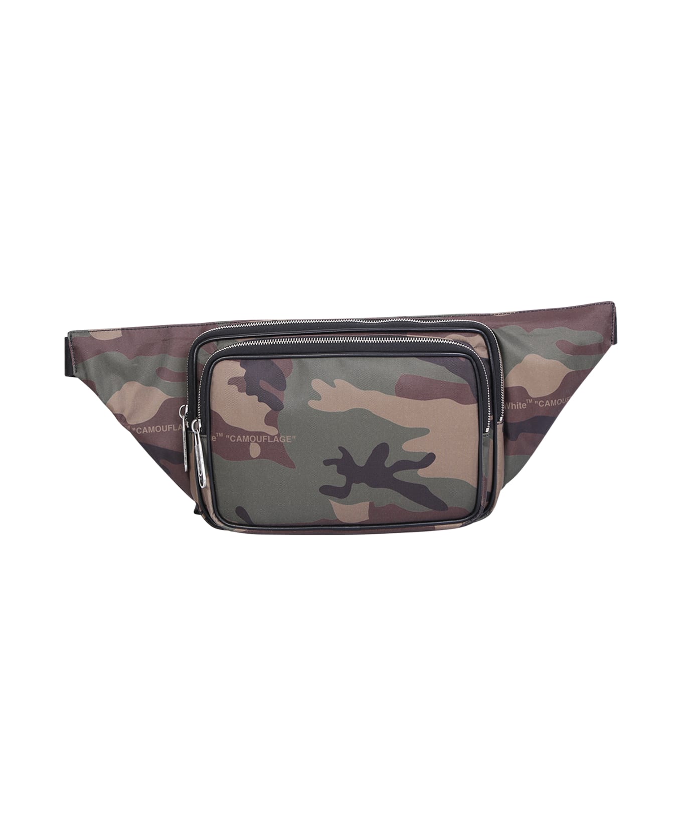 Top zip fastening. Main compartment. Front zip fastening pouch pocket. Adjustable waist strap. Signature paperclip detail. Camouflage motif. Logo print to the front. Silver tone hardware. Color: multicolor