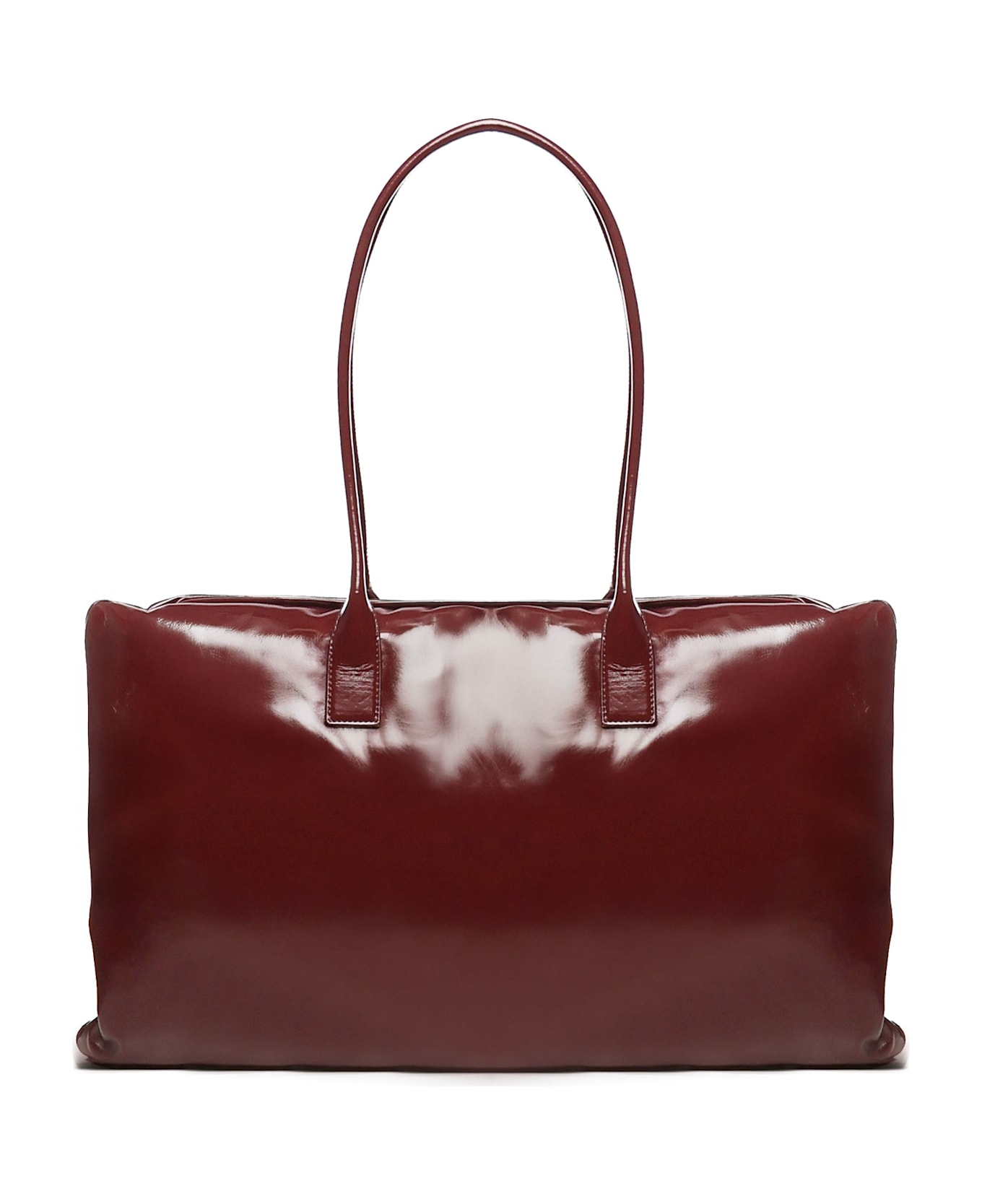 -Large puffy leather shoulder bag -One inside pocket with zipper, two open pockets, one hook -Zipper closure -Measurements: 34. 5 x 60 x 3 cm -Made in Italy -Color: Bordeaux