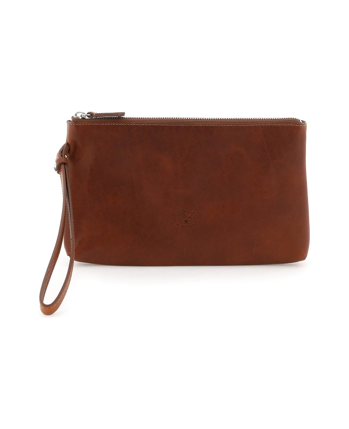 Il Bisonte pouch made of leather with zippered closure, fabric interior with one open pocket and detachable wrist handle. Silver-finished metalware.