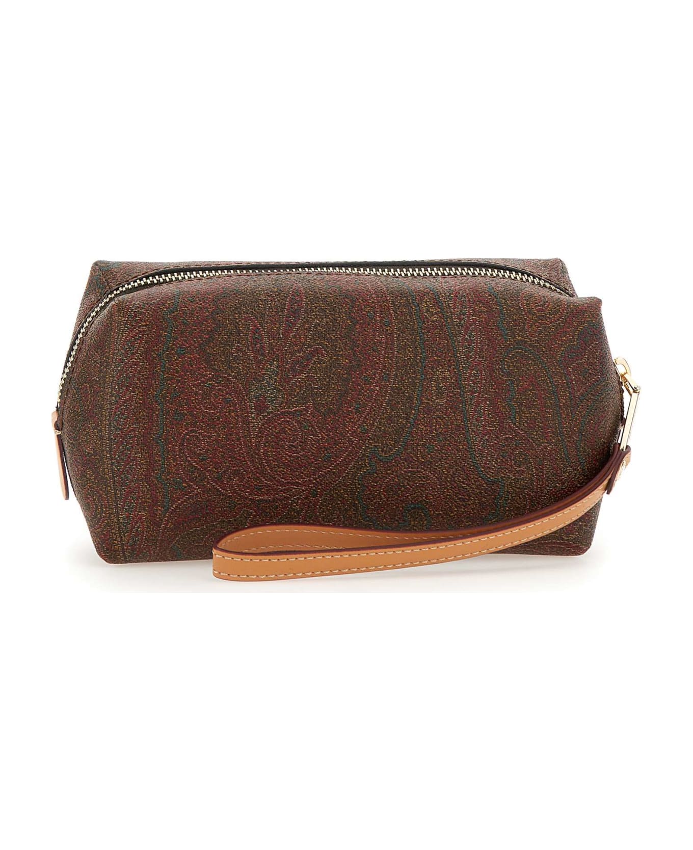 Etro men's jacquard cotton fabric clutch bag in Paisley coated with matt grain and doubled in canvas, multicolor in shades of brown and burgundy, zip closure,gold metallic finishes, logoed fabric lining, sleeve to be worn on wrist. Storage bag included. Measures: length 20cm, height 10cm, depth 8cm. Made in Italy.