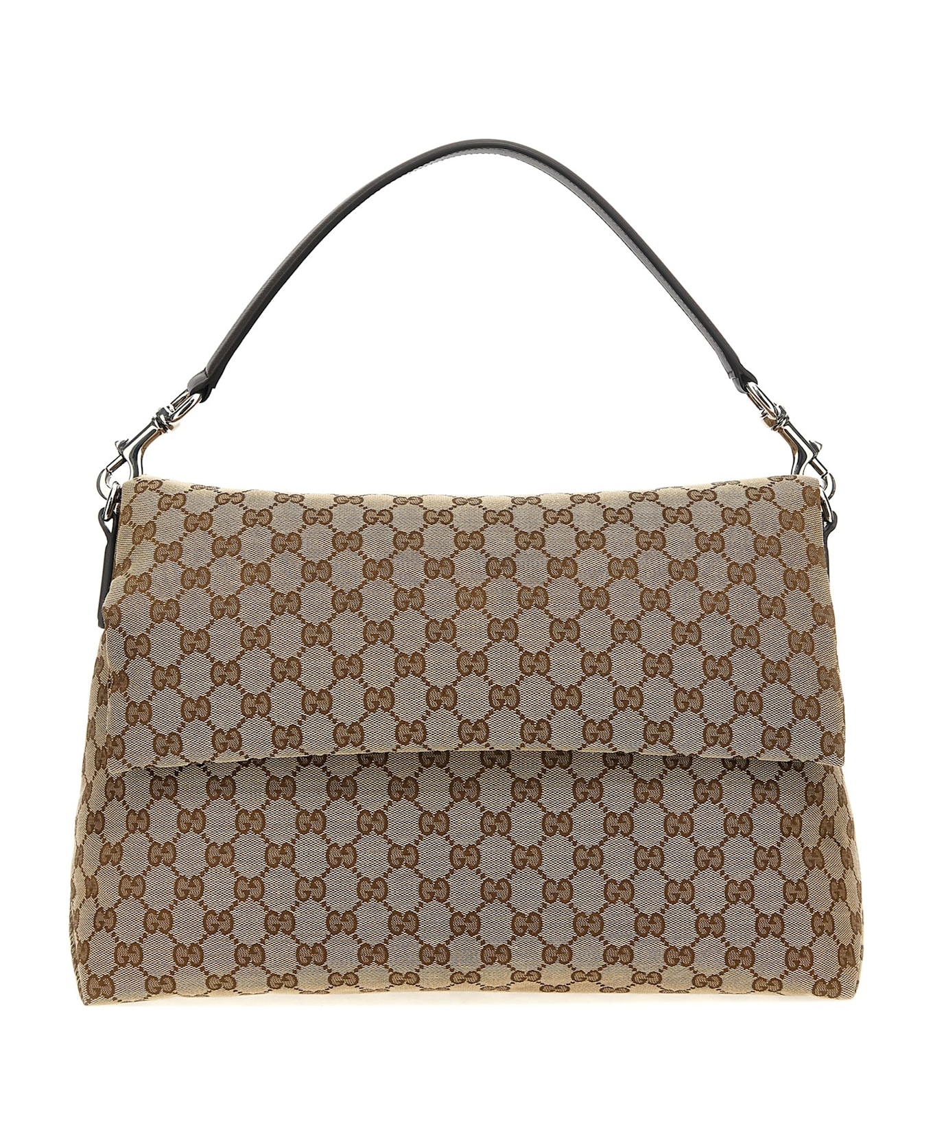 Padded GG fabric shoulder strap, magnetic flap closure, back leather pocket with embossed logo, removable leather handle, adjustable and removable web fabric shoulder strap. Composition: 65% polyester 18% cotton 17% polyamide