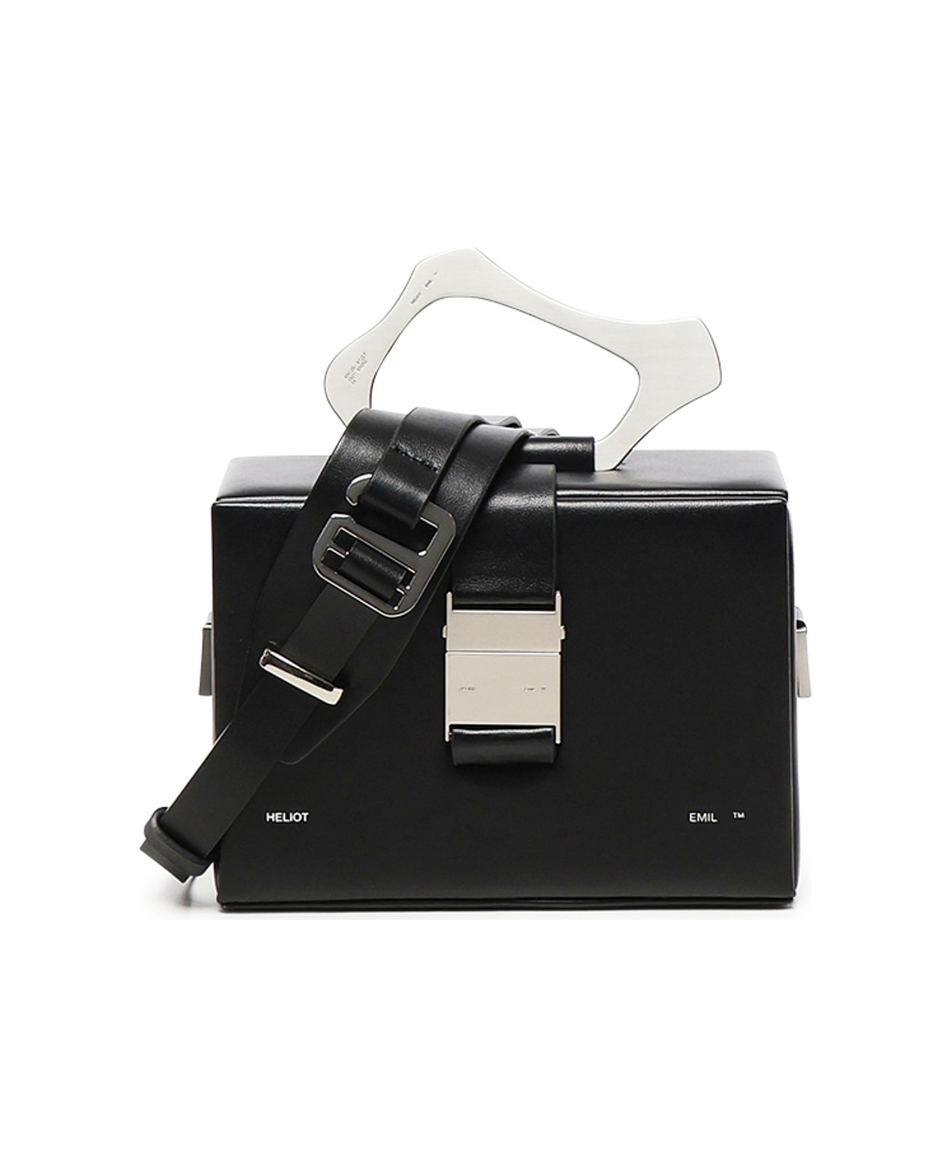 -Rigid box structure -Single compartment -Metal carabiner -Top handle -Metal snap buckle closure -Custom hardware finishing -Silver Heliot Emil logo on the front -Measurements: 18. 5 x 13 x 7. 5 cm -Color: Black