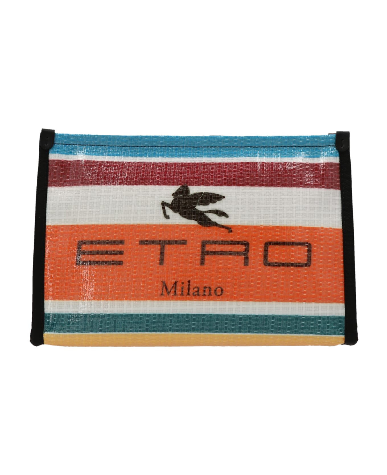 'Spice Glass' fabric clutch bag with multicolor stripe print with logo, leather details, zip closure and wrist strap.