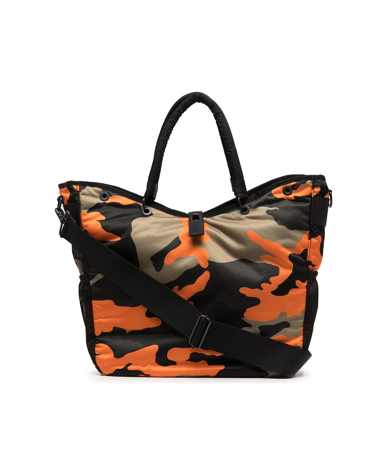 gree/orange/black logo patch to the front camouflage pattern two long top handles adjustable detachable shoulder strap