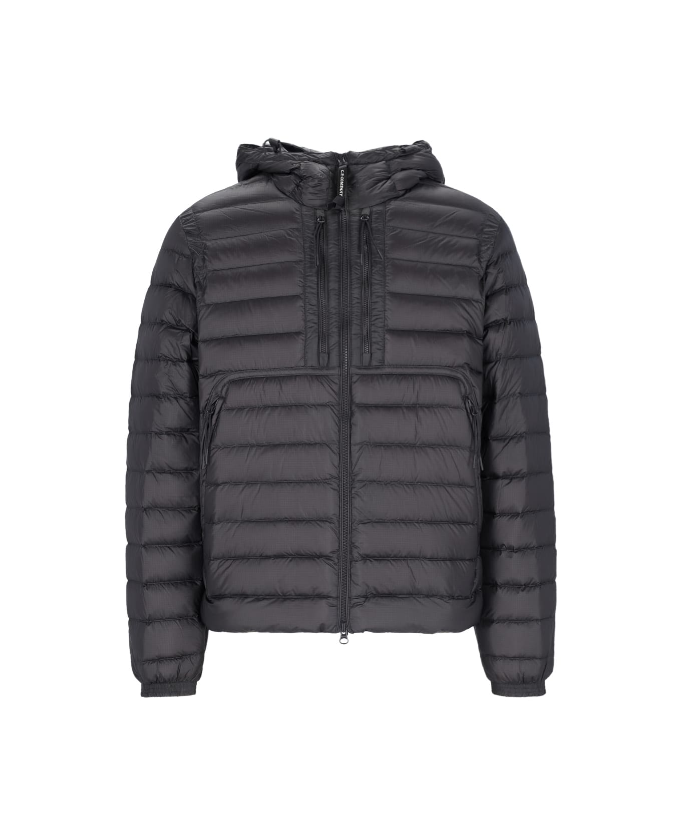 C. P. Company "D. D. Shell Google" black nylon hooded down jacket with quilted and padded design, iconic Google hood with drawstring, double zip closure with logo zipper puller, two chest zip pockets, two maxi front zip pockets, straight hem, drawstring detail on the bottom.