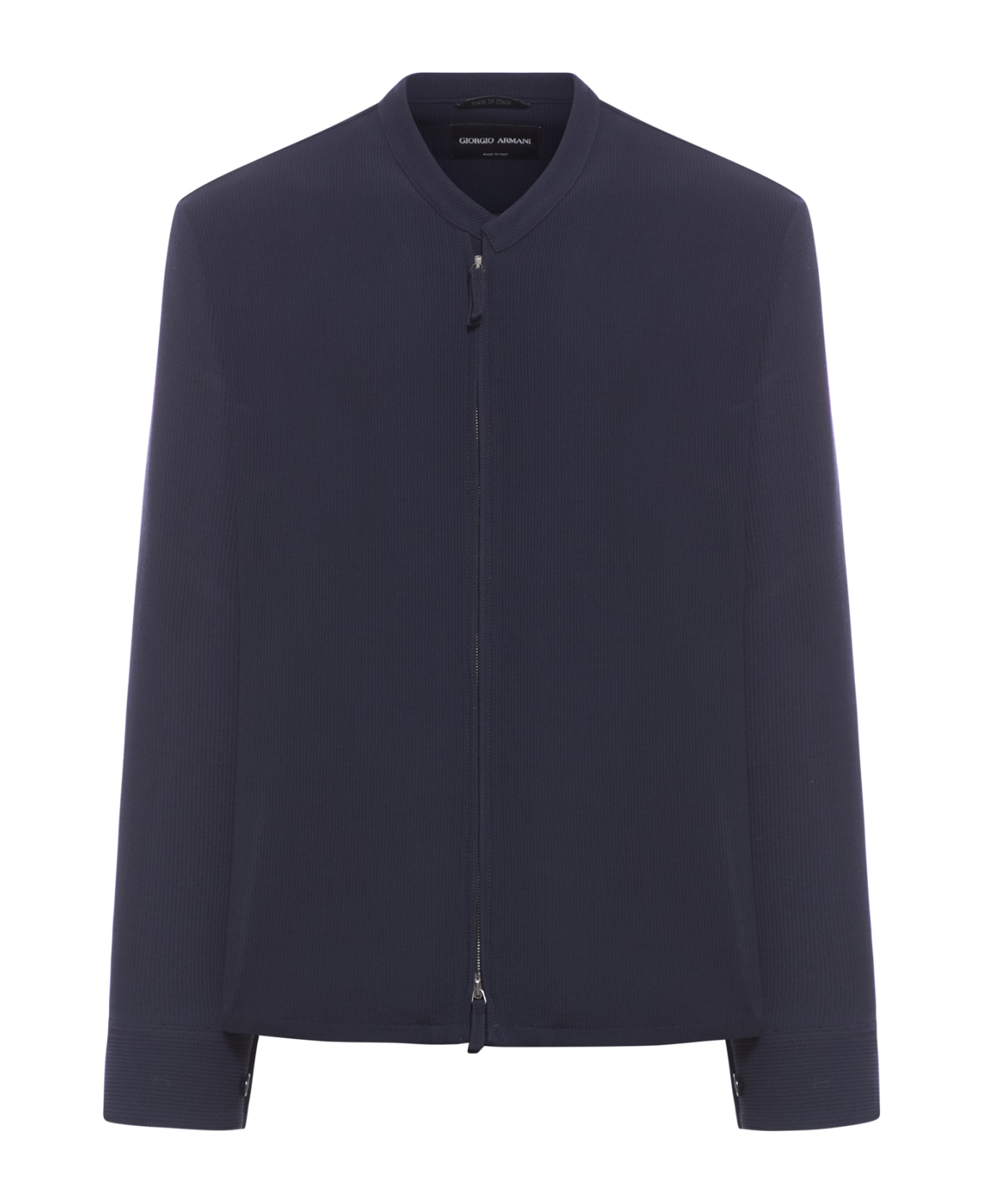 -tone-on-tone stitching -stand-up collar design -two-way zip front closure -long sleeves -shirt cuff -curved hem -rib knit -Blue