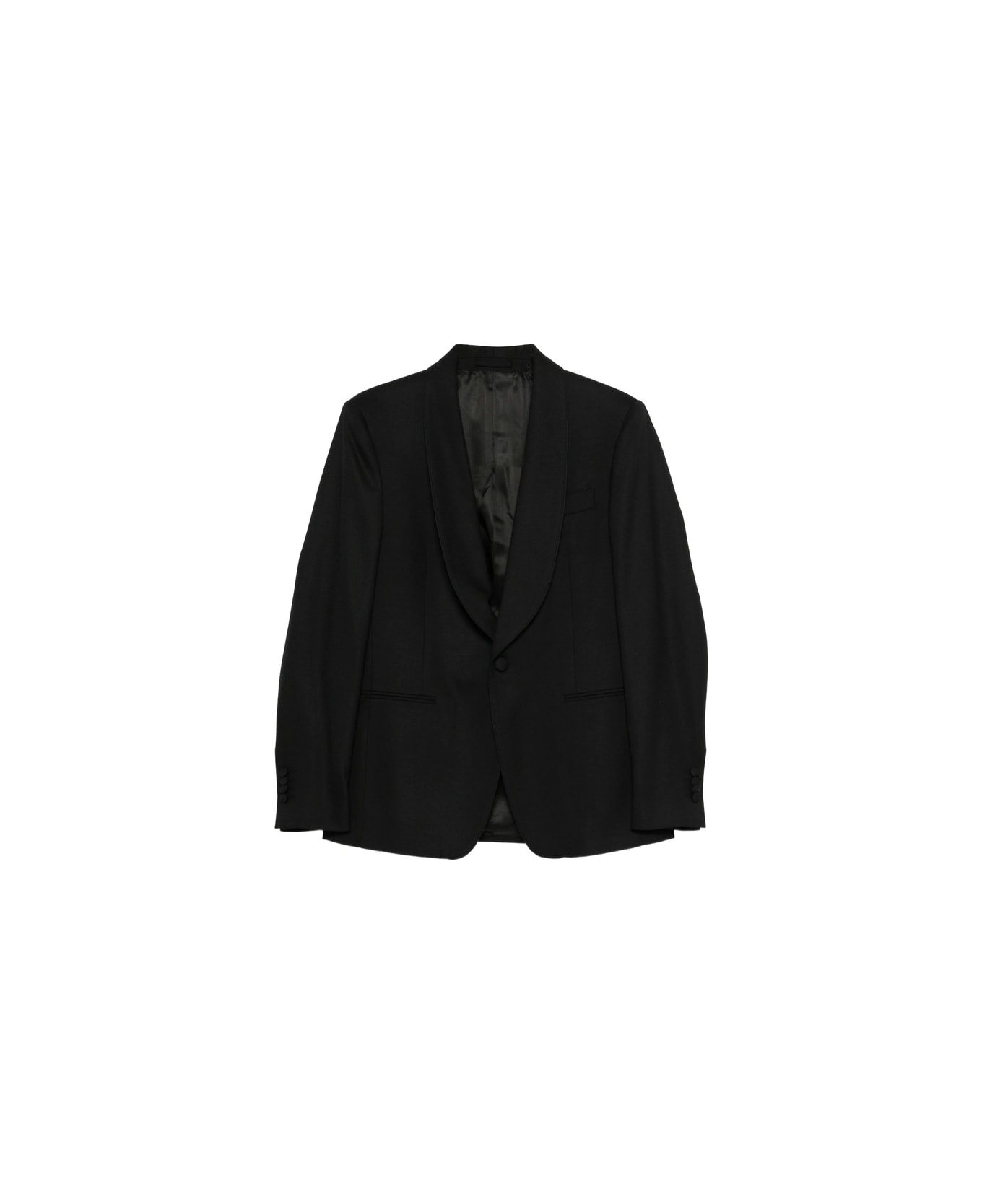 black shawl collar single breasted front button fastening long sleeves buttoned cuffs