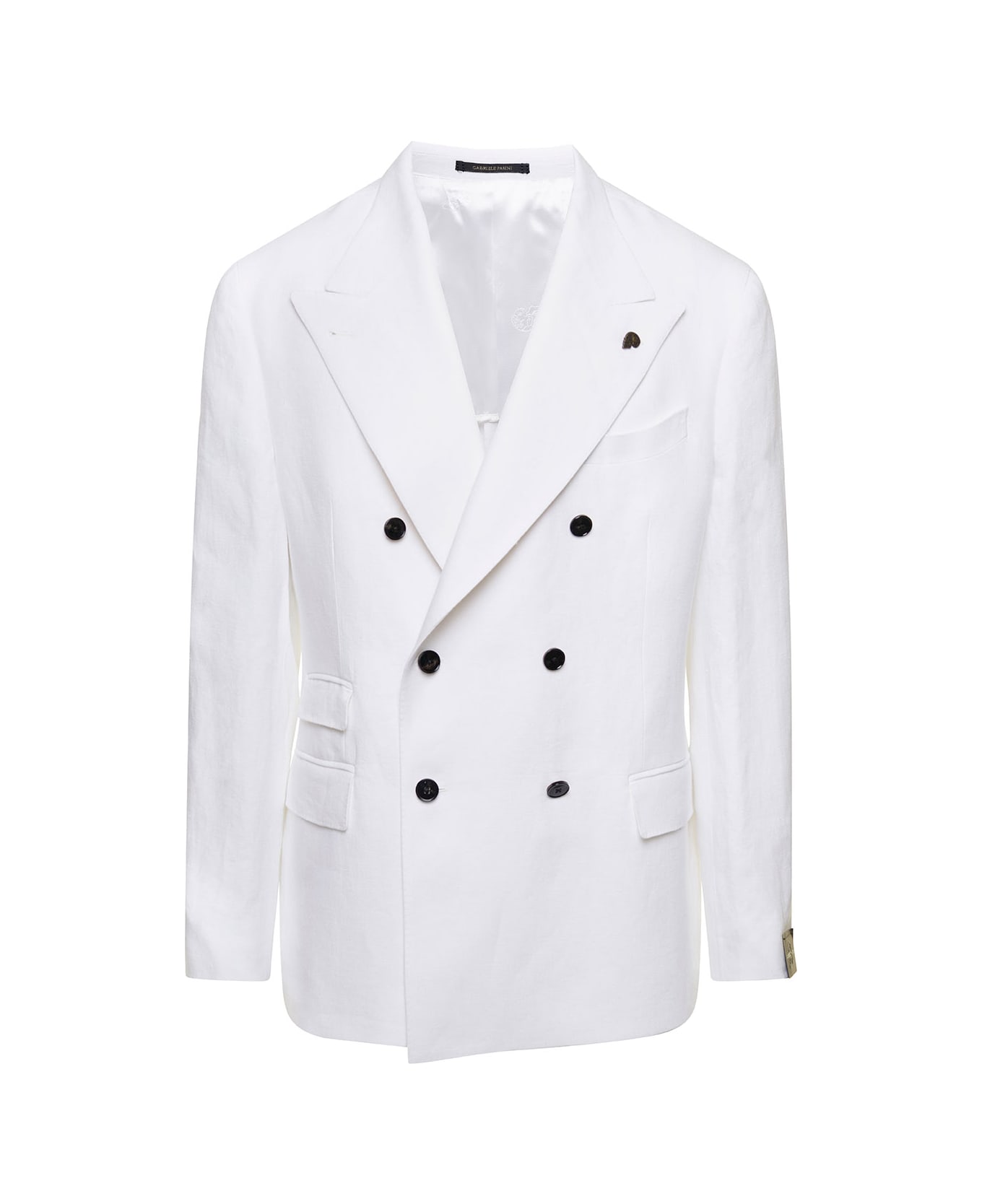 Double-breasted jacket Peaked revers Long sleeves Front button fastening Skull pin detail Two front patch pockets Straight hem White Linen Regular fit