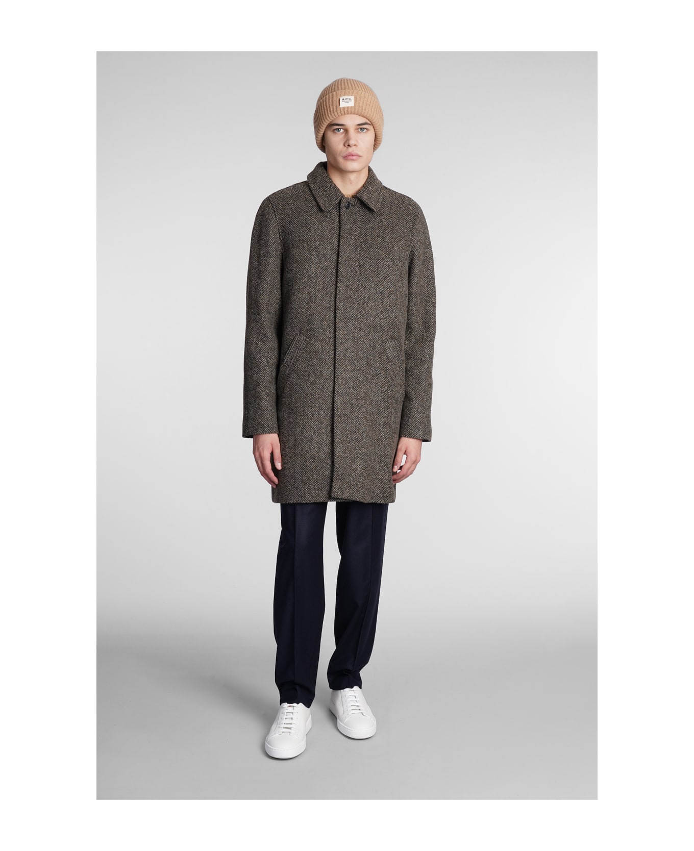 Pete Coat in beige wool, collar, long sleeves, pockets on side, tweed, hidden closure with buttons, 100% wool, Made in Bulgaria, Model is 1. 83 and wears size M