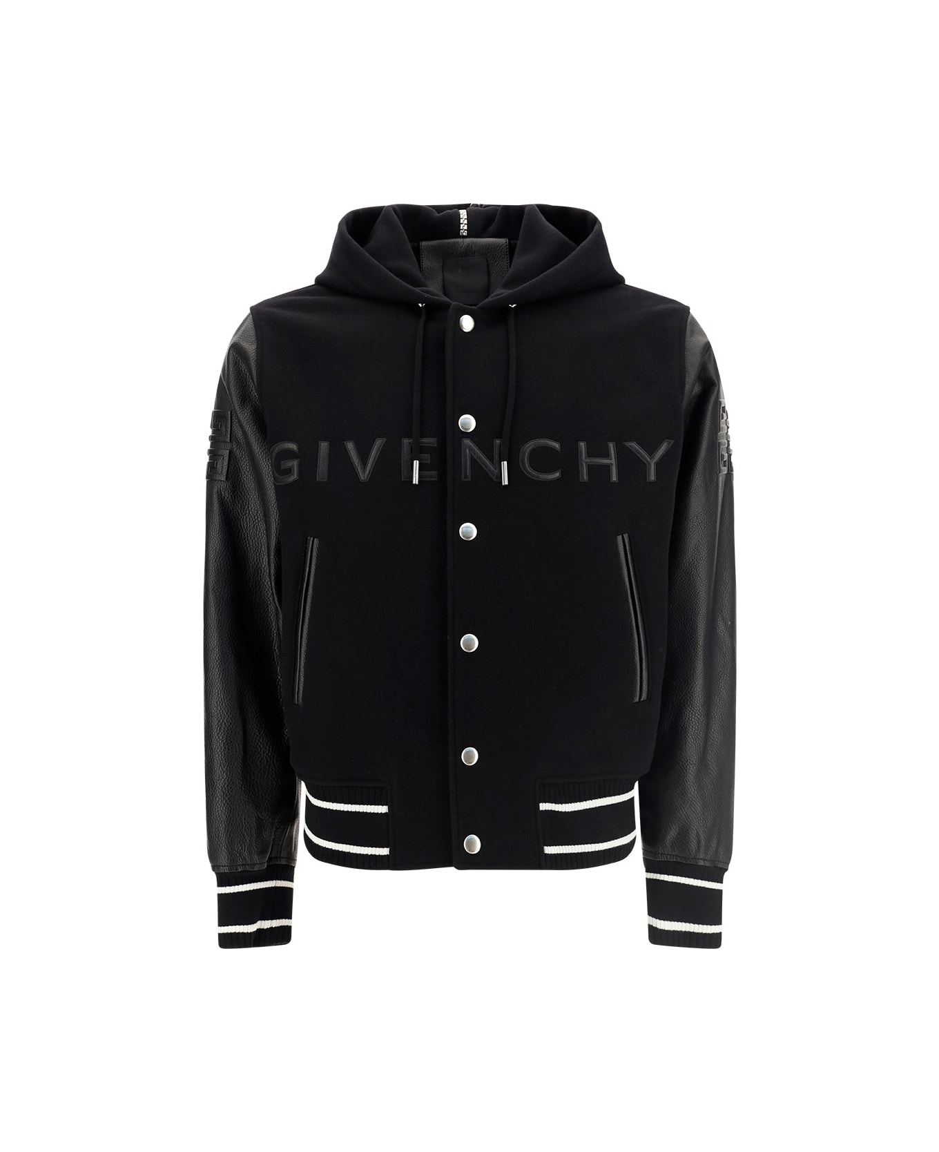 Fleece wool bomber jacket by givenchy, design with drawstring hood, ribbed cuffs, front snap button closure, elasticated ribbed hem, two side welt pockets, iconic tone-on-tone brand signature on front.