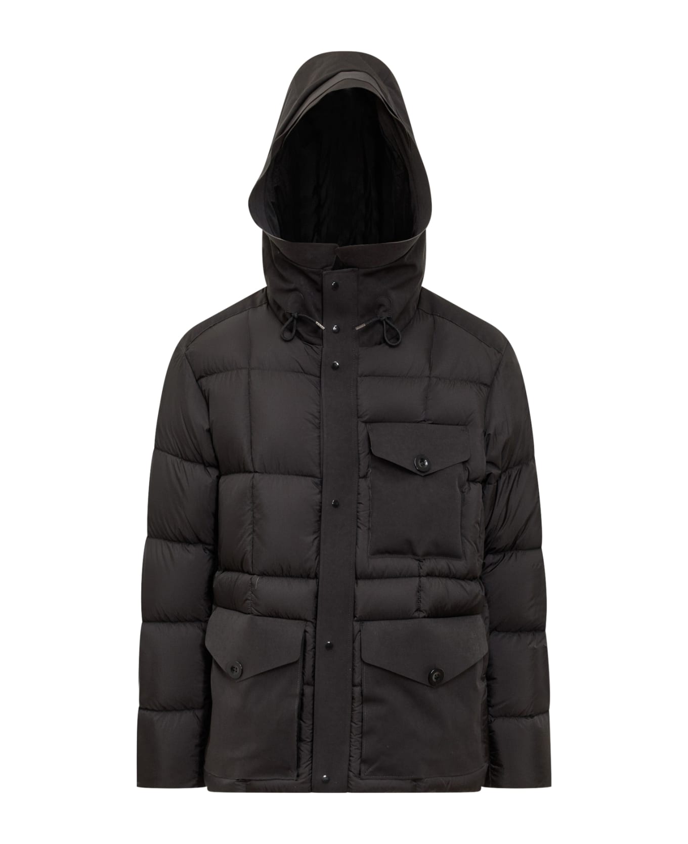 Black long sleeve down jacket. Drawstring hood. Front zip and button closure. Front pockets.