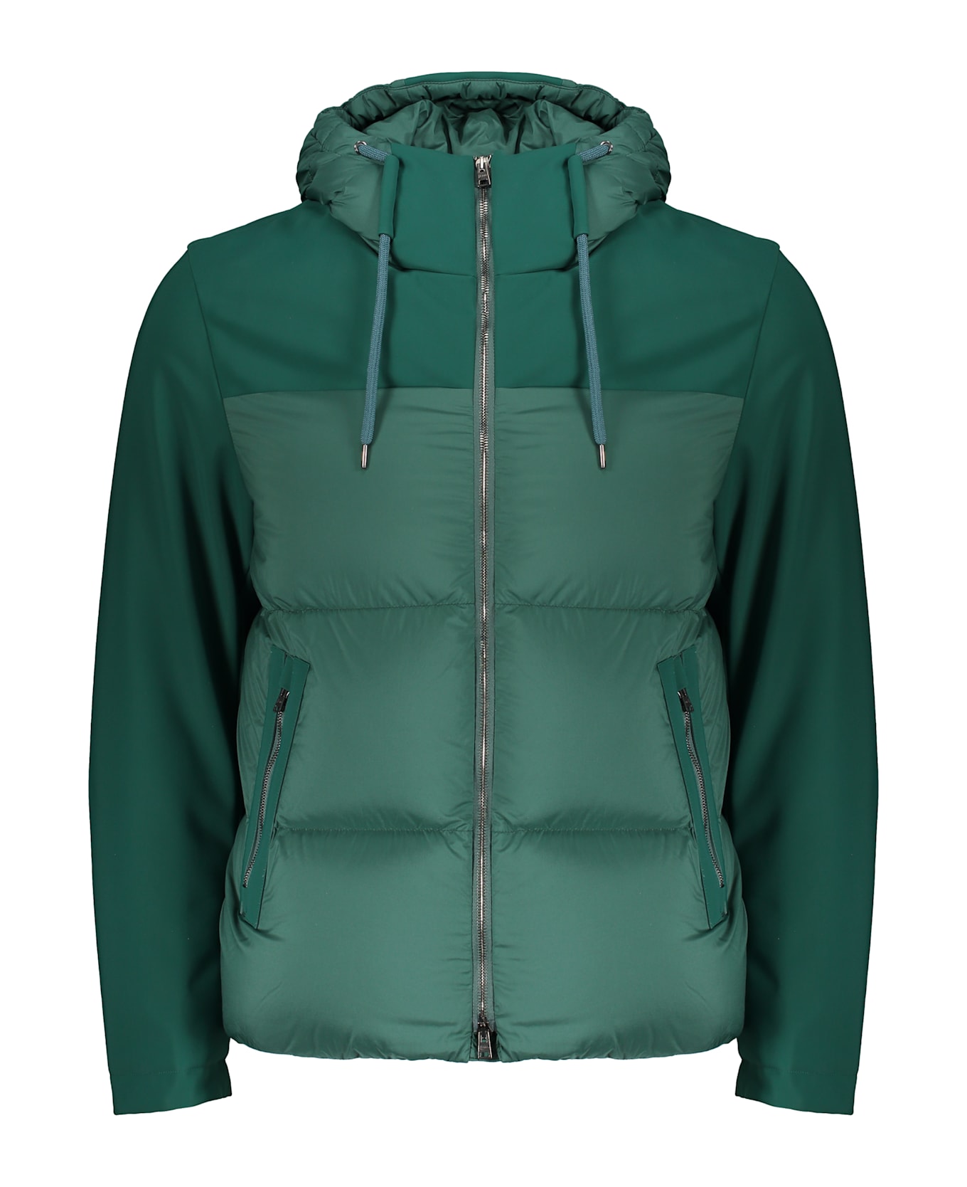 Padded jacket with hood, characterized by a modern and functional design. made from a green-colored fabric, it features a front zip closure and side pockets. the long sleeves and hood provide protection and comfort, making it ideal for cooler days. the padding ensures warmth without compromising lightweight, perfect for outdoor activities or daily use.
