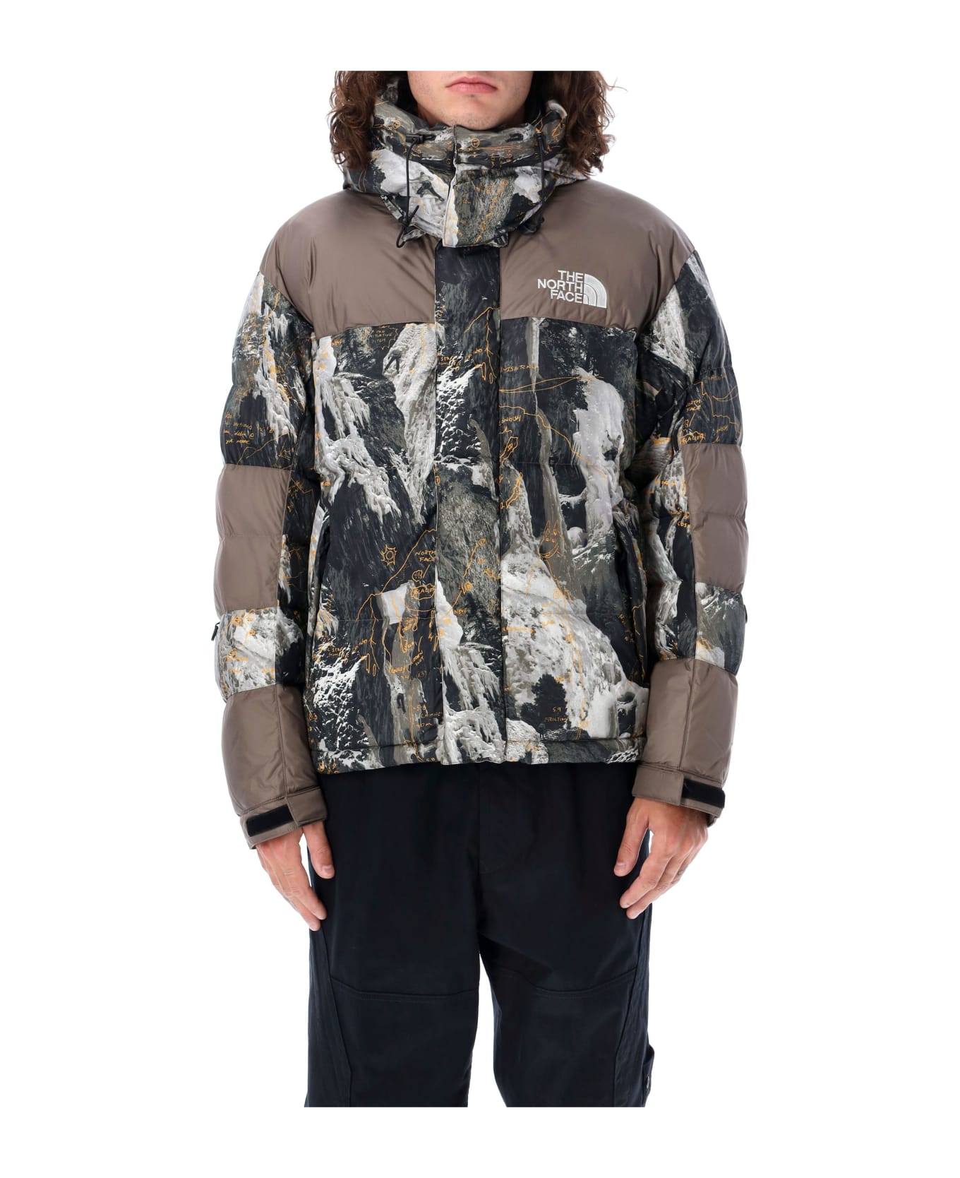 Himalayan Baltoro Jacket By The North Face. Featuring: Long Sleeve High Neck Detachable Hood Central Zip And Velcro Closure Lateral Zip Pockets Embroidered Logo At Front And Back Velcro Straps At Wrists Elasticated Hem Inner Pocket Graphic Print Pattern Contrasting Panels Water-repellent Wind-proof Down-filled Model Is 1,90 M Tall And He Is Wearing Size L