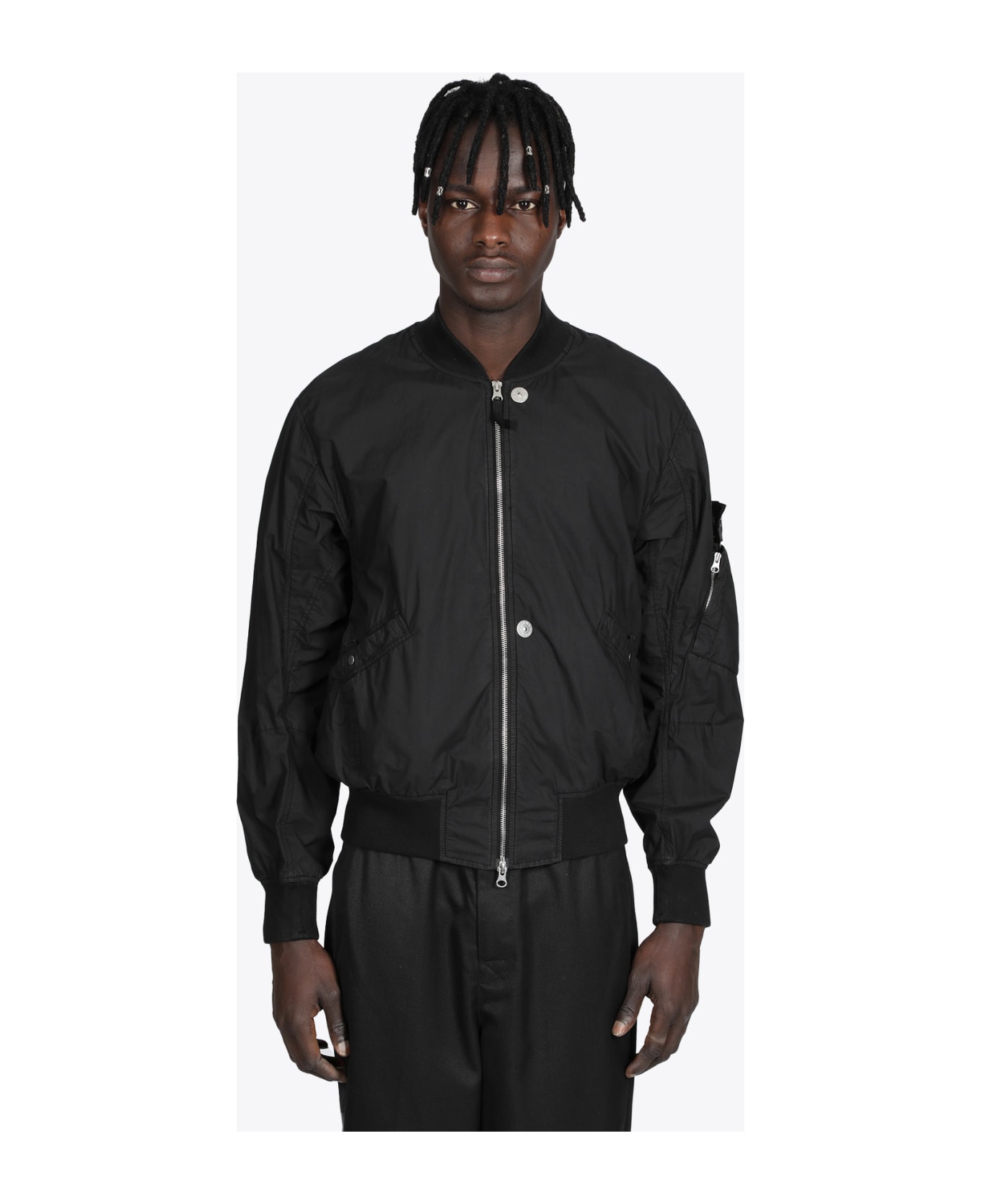 Black cotton bomber jacket, metal zip closure, front flap in glass linen with metal snap closure, two side pockets with snap closure, rib-knit collar, cuffs and bottom hem, sleeve pocket with metal zip and hidden Stone Island Shadow Project badge, back horizontal bottom vent revealing the inner cooling cotton mesh lining, innner shoulder straps, regular fit. The model is 185 cm and wears size M. Composition: 100% cotton. Made in Italy.