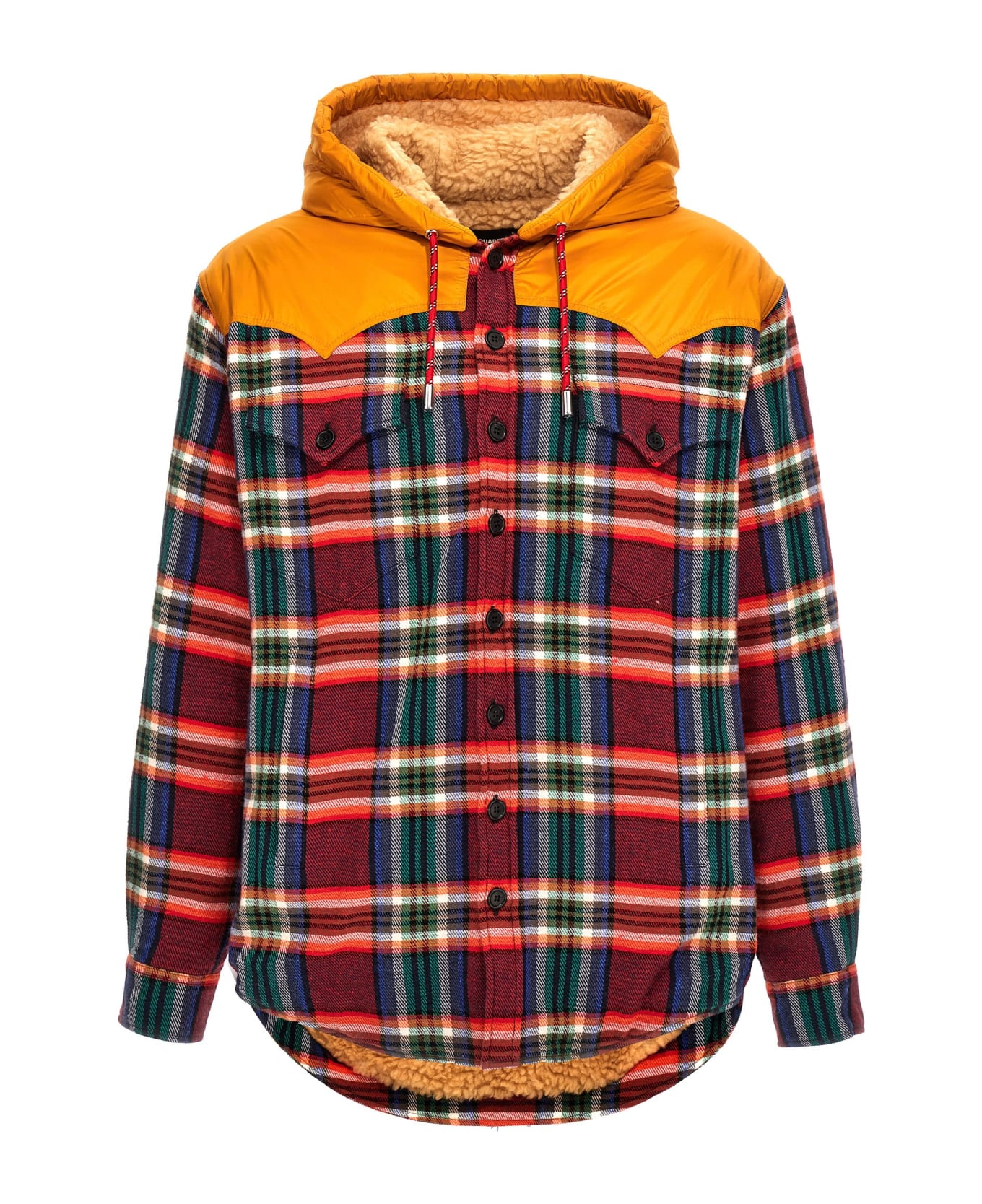 'Canadian Overshirt' check print flannel jacket with sherpa lining, nylon insert and hood, pockets, button closure, long cuffed sleeves.