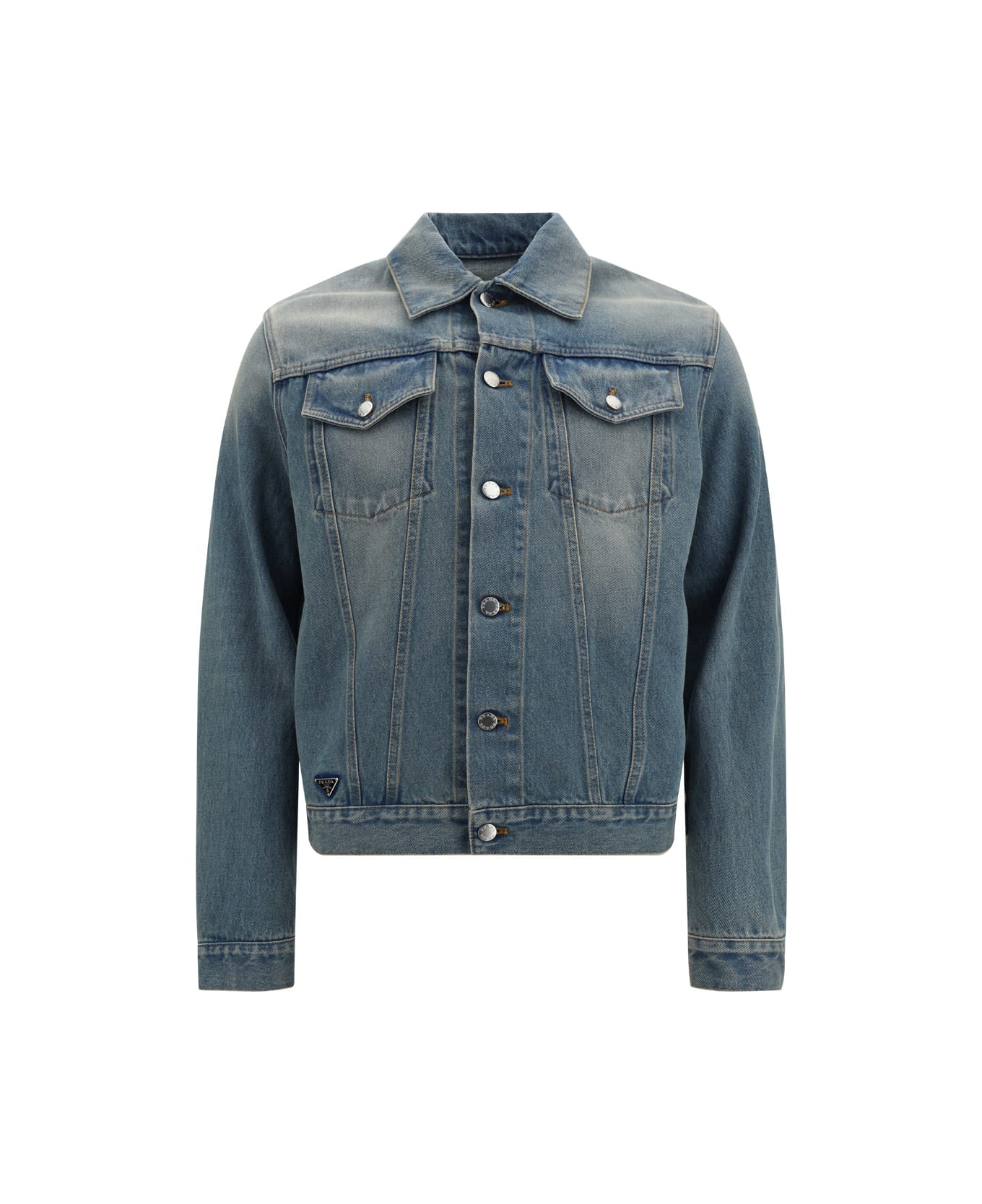 Cotton denim jacket by prada, classic collar, two front flap pockets, front button closure, iconic enameled triangular brand signature plaque applied to front, regular fit. Composition: 100% % Cotton