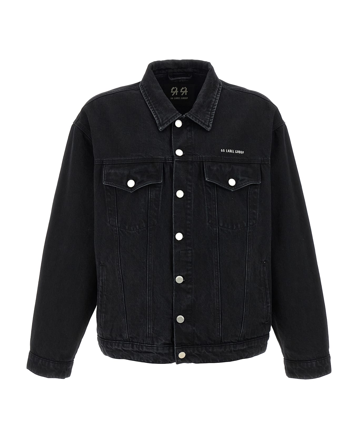 Used-effect cotton denim jacket with front and back print, removable logo tape, front button closure, long cuffed sleeves and dropped shoulders, pockets.