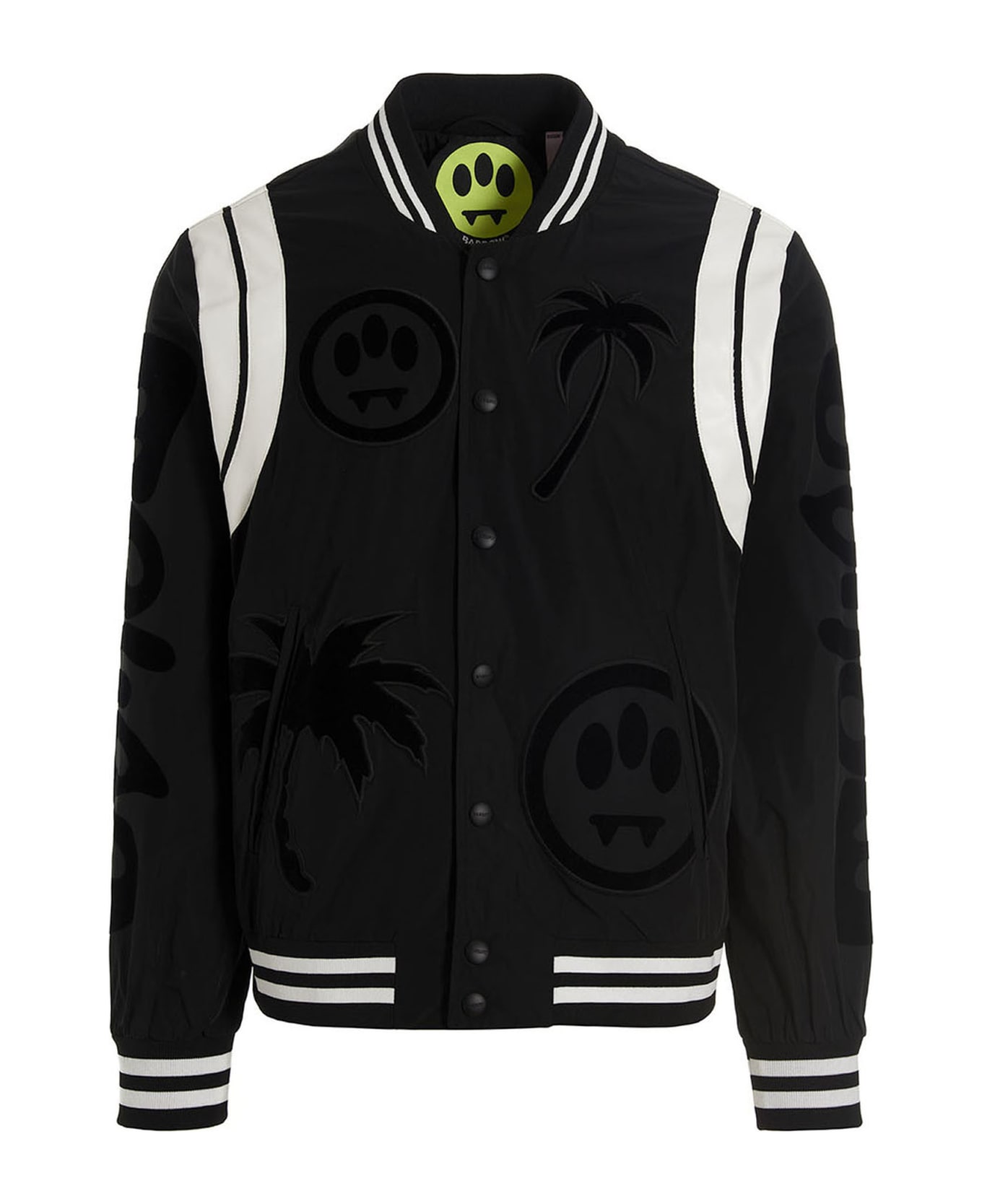 Nylon bomber jacket with flocked print details and all-over tone-on-tone embroideries, contrast leather details, a button closure, pockets, long cuffed sleeves, collar, cuffs and knitted bottom hem.