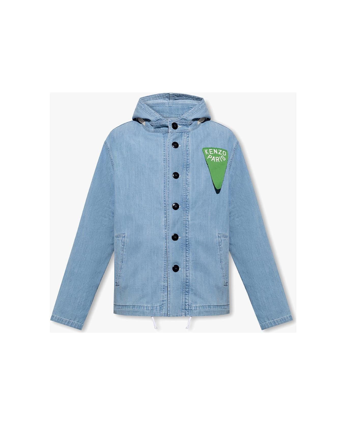 Light blue hooded denim jacket from Kenzo. Fastened with buttons, this lightweight garment is complete with a wave and star pattern, logo in navy and red, adjustable straps in cream at the neckline, two slip pockets, long sleeves and drawstring hem.