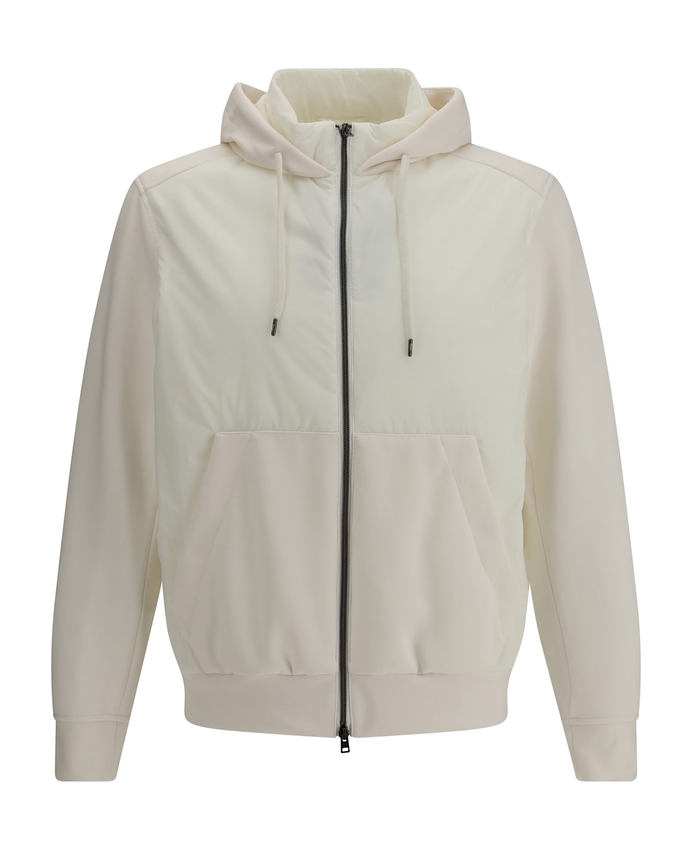 The hooded jacket by herno is crafted from polyamide with contrasting inserts inspired by classic sweatshirt detailing. it features a drawstring hood with front cords, a zip fastening, and a clean, contemporary silhouette. a versatile piece designed for a practical yet refined look.