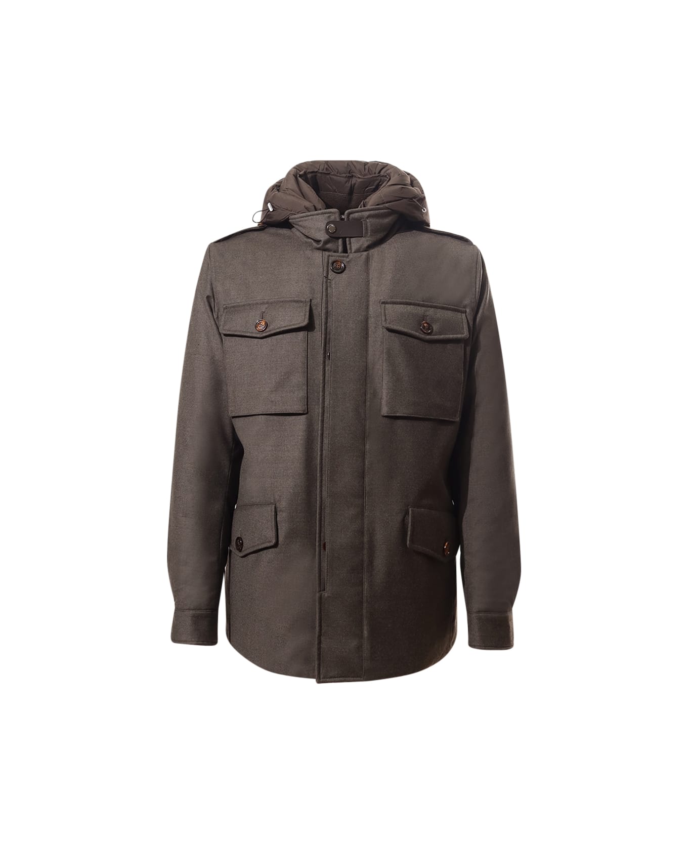 Front closure with two-way zip and buttons, hood with removable drawstring, two side pockets with flap, two patch pockets on the chest with flap and button, quilted inside, water resistant. Color: Forest. Composition: 90% Virgin Wool, 5% Cashmere, 5% Polyurethane. Made in Italy