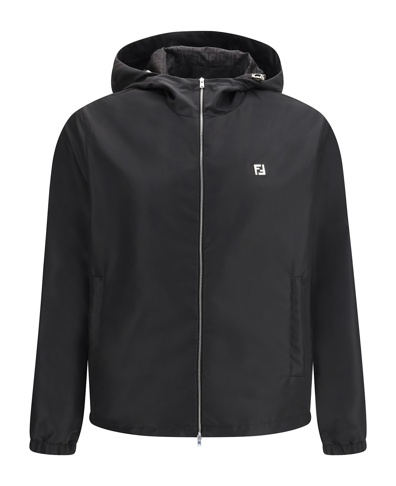The technical fabric jacket by fendi is a functional and contemporary garment, crafted in black technical fabric. featuring a drawstring hood with tone-on-tone ff fabric interior, elasticated cuffs and hem, it has side pockets and a double-slider zip closure. the small metal ff logo on the chest and palladium-finish metal accessories complete the design, combining distinctive style and practicality.